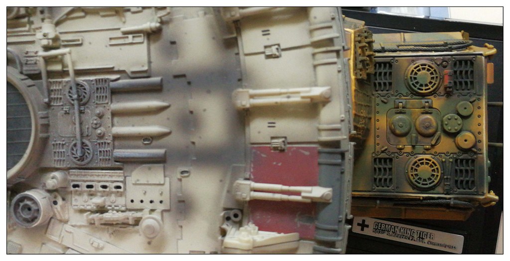 ▼ 千年鷹號尾部上方圓形散熱口後之機件造型 VS. 二戰德軍虎王坦克的引擎蓋。