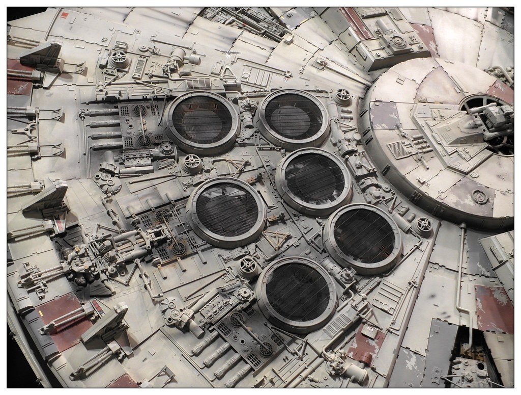 而無庸置疑的,比例越大的模型所擁有的造型細節自然會更加精密,那些被道具製作人員所採用的市售模型零件在不同比例下當然也是如此! 所以千年鷹號的道具模型,1.7 公尺的版本表面機械精緻度當然會遠高於80 公分的版本。