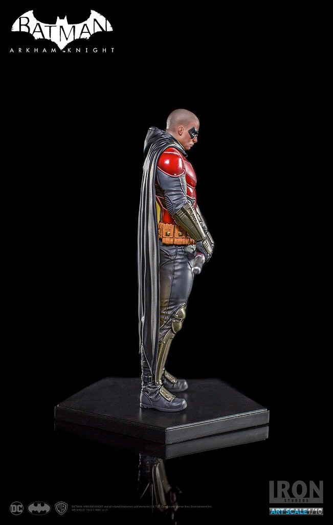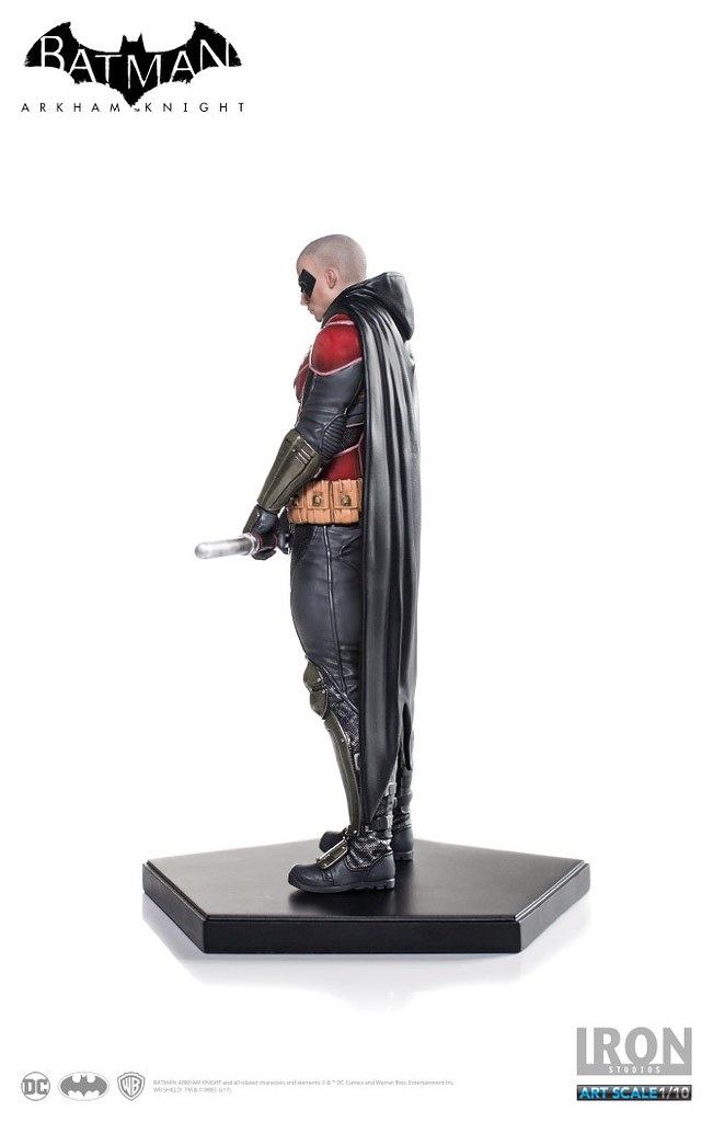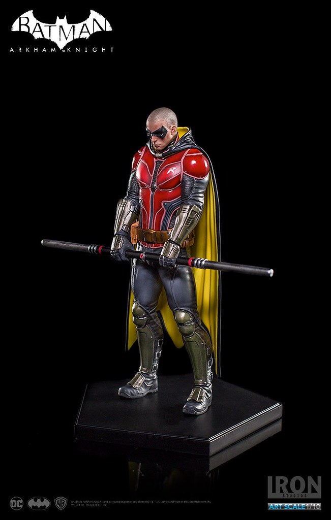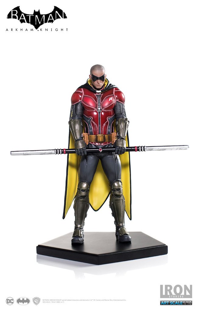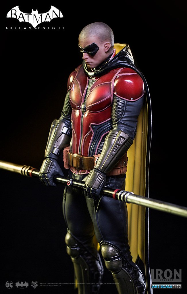 《蝙蝠俠:阿卡漢騎士》裡的羅賓頂著一顆俐落的光頭,配戴他的標準武器「長棍」,上半身鮮紅色的盔甲搭配黃色內襯的披風相當有特色,Iron Studios 將羅賓在遊戲中的樣貌完整重現,裝備、護甲、以及頭雕的刻畫都十分細膩,左胸上的「R」更是代表性十足;值得一提的是限定版附有未戴眼罩版本的頭雕,雙手緊握長棍、蓄勢待發的姿態也反映了他善於冷靜分析的沉著個性,這版造型的羅賓真的非常帥氣啊!!
