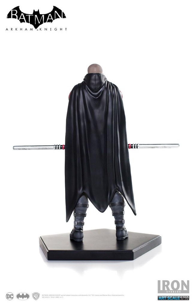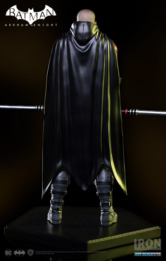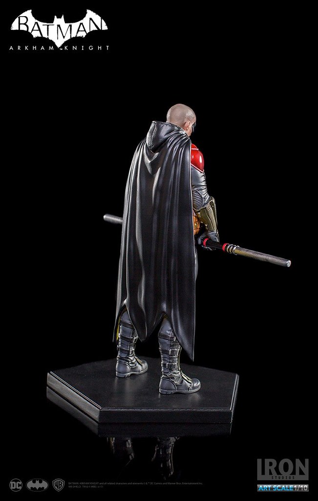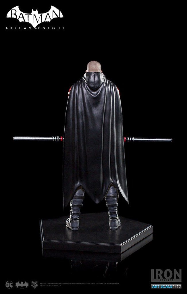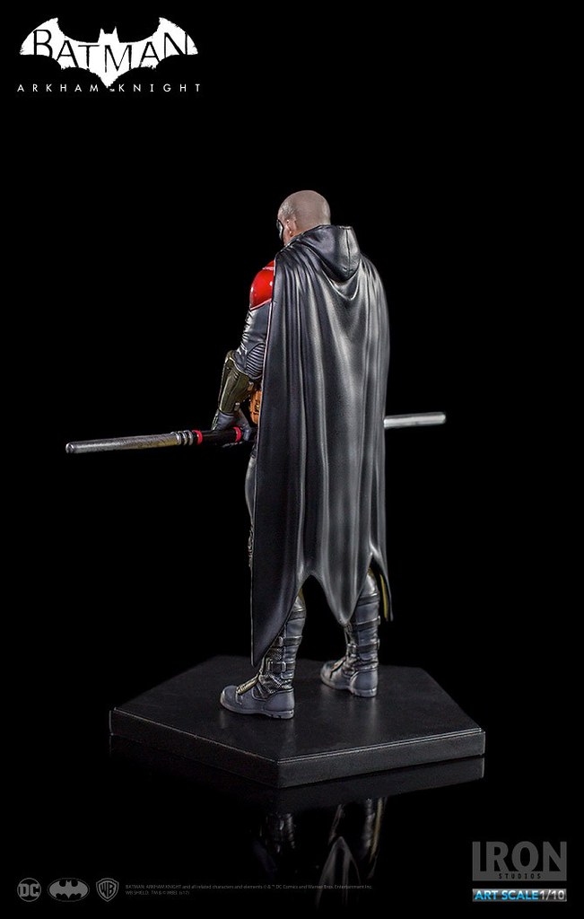 《蝙蝠俠:阿卡漢騎士》裡的羅賓頂著一顆俐落的光頭,配戴他的標準武器「長棍」,上半身鮮紅色的盔甲搭配黃色內襯的披風相當有特色,Iron Studios 將羅賓在遊戲中的樣貌完整重現,裝備、護甲、以及頭雕的刻畫都十分細膩,左胸上的「R」更是代表性十足;值得一提的是限定版附有未戴眼罩版本的頭雕,雙手緊握長棍、蓄勢待發的姿態也反映了他善於冷靜分析的沉著個性,這版造型的羅賓真的非常帥氣啊!!