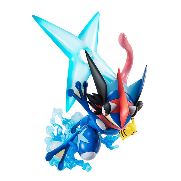 作為寶可夢 721 總選舉之首,甲賀忍蛙毫不意外也加入立體化的陣容,這次更是以「小智版甲賀忍蛙」的姿態與小智、皮卡丘一同投擲巨大飛水手裡劍,再現充滿躍動感的戰鬥場景!整體不論是服裝細節、造型的銳利度皆很出色,透過色彩精緻的變化呈現動畫風格的光影,透明材質製作的水特效相當華麗,躍動的水花造型更增添作品的魄力!