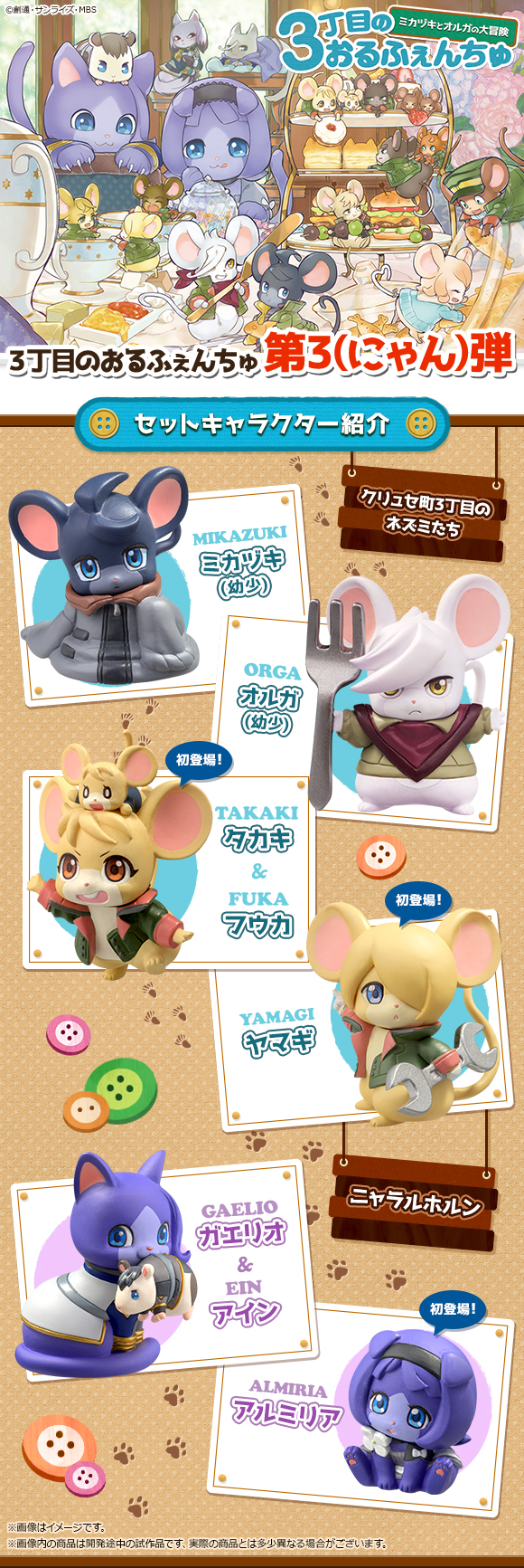 繼極度好評的「第一彈」、「第二彈」後,日本Megahouse 玩具公司今(27)日再度發表了將《機動戰士鋼彈 鐵血孤兒》中的人物化身為超可愛鼠貓的第三彈商品「3丁目的孤兒 第3(Nyan)彈」(3丁目のおるふぇんちゅ 第三(にゃん)彈)預計於 2017 年 11 月下旬發售的消息。