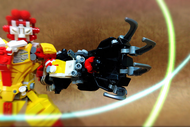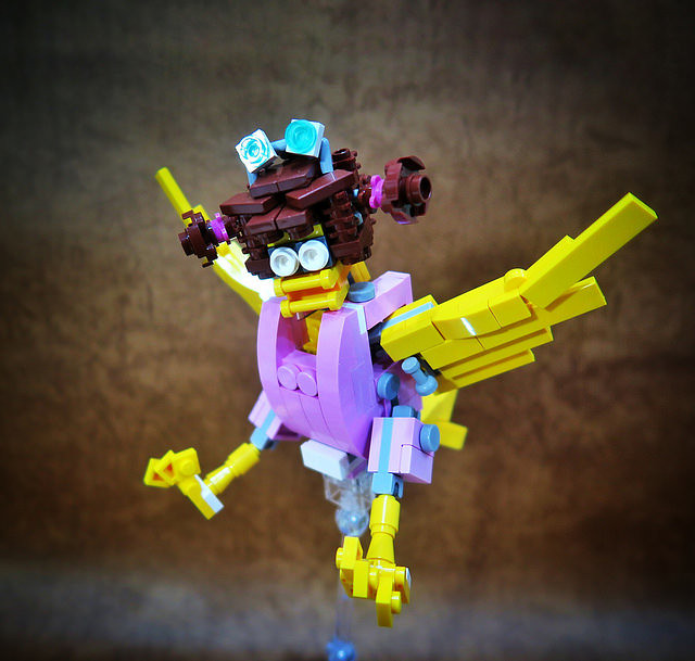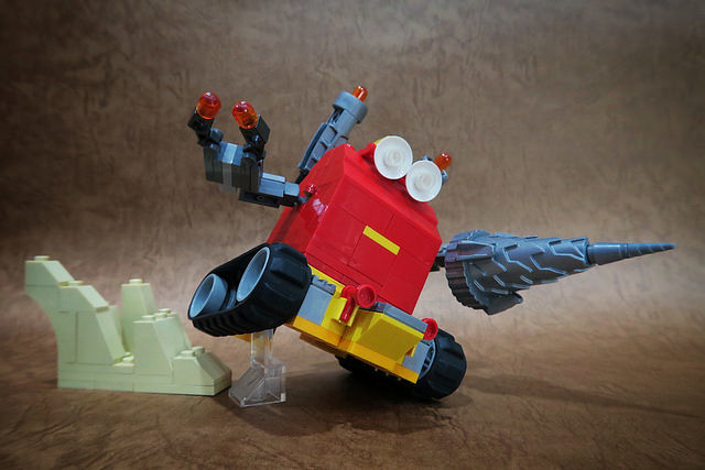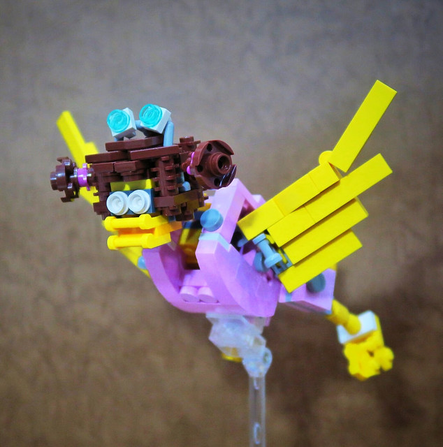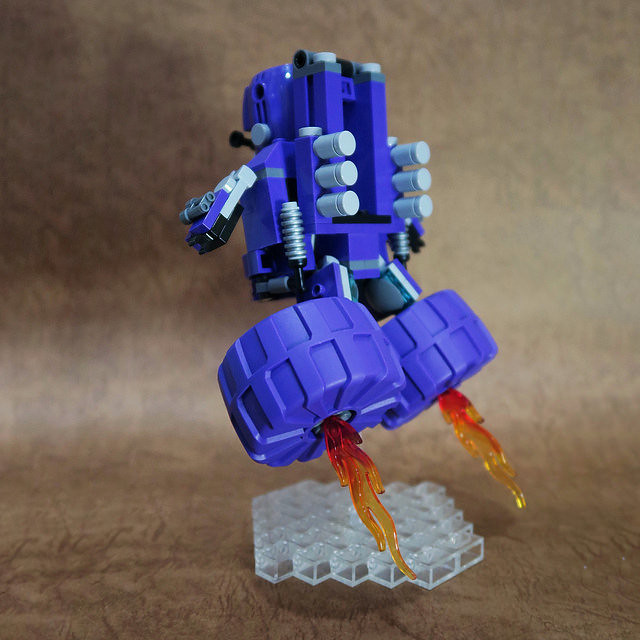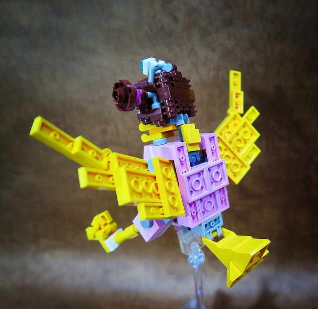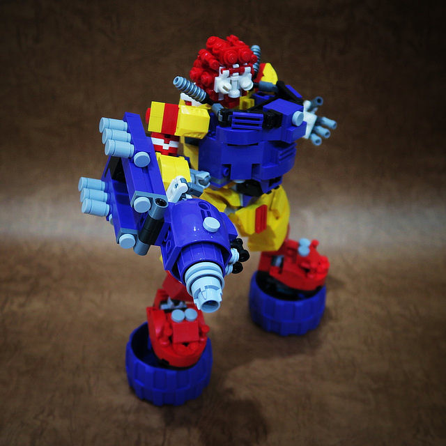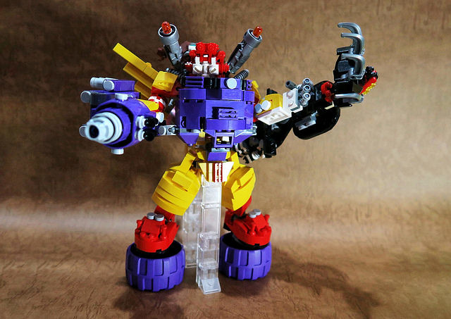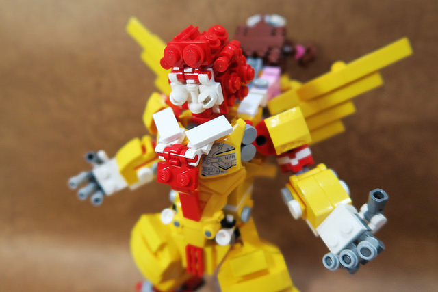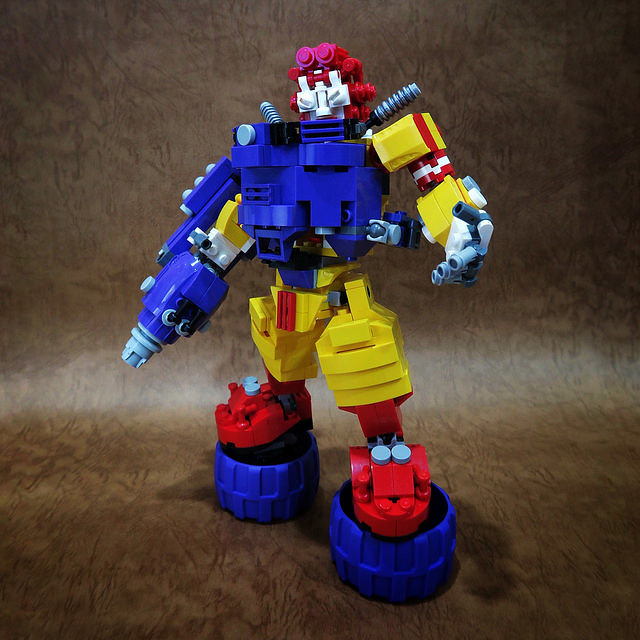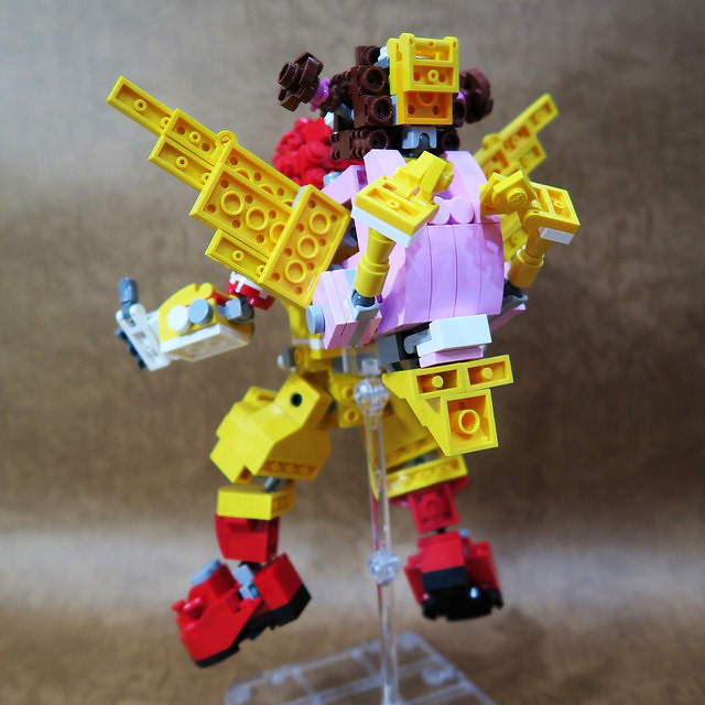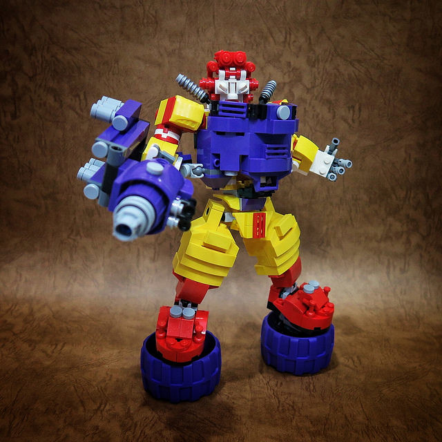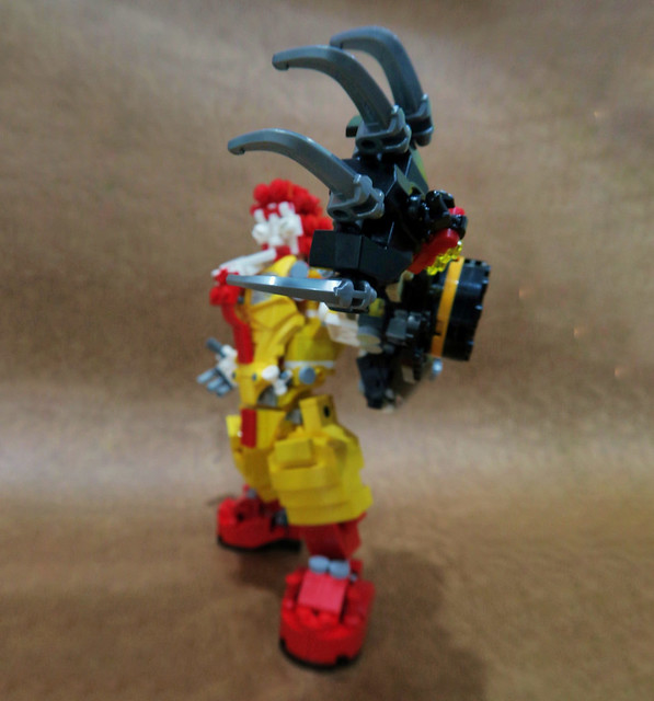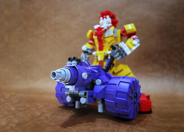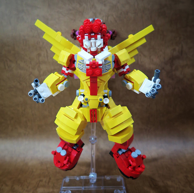 採用小片的零件、極具巧思的設計將大鳥姊姊的頭髮高度重現,嘴巴零件的挑選也很有意思,相當有味道啊~黃色翅膀還有可動機關;變形後的型態是附著在「麥當勞叔叔機甲」背上,增加「人鳥大混合」的飛行功能。