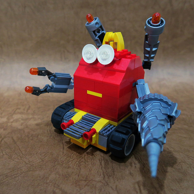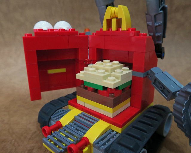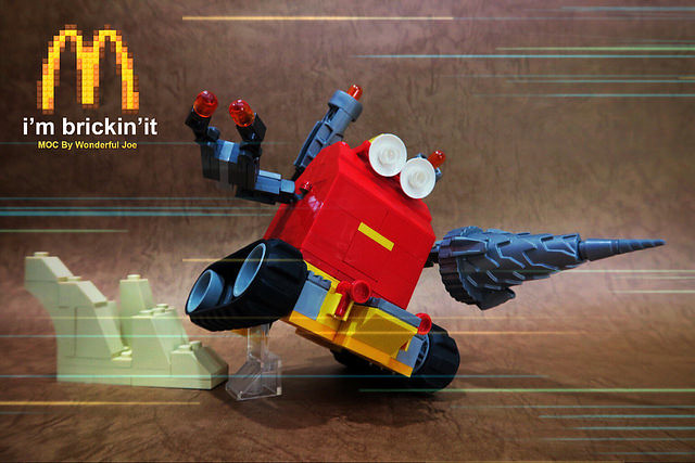 既然講到麥當勞玩具,馬上就會聯想到「快樂兒童餐」,Joe Chan 也把經典的紅色快樂兒童餐餐盒樂高化,以坦克型輔助載具的身份登場!裡頭裝著可愛的方形漢堡,滿滿的安格斯牛肉絕對讓你能快速補充生命力!