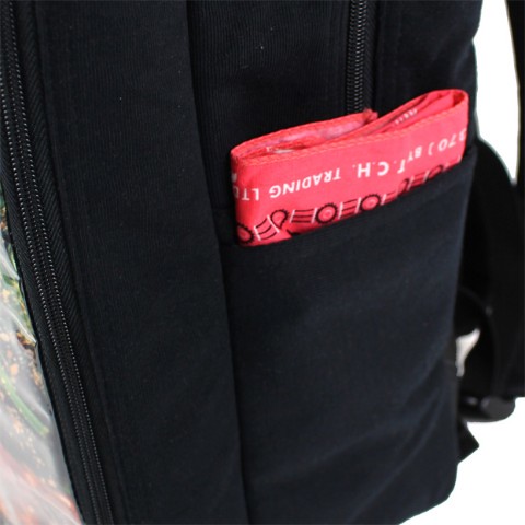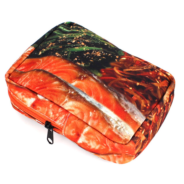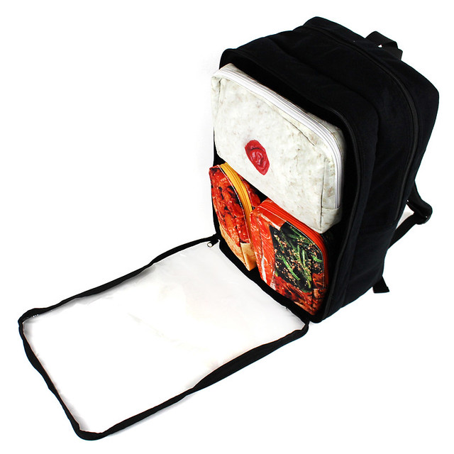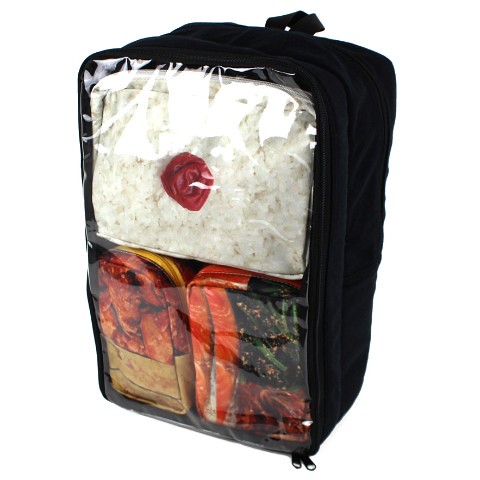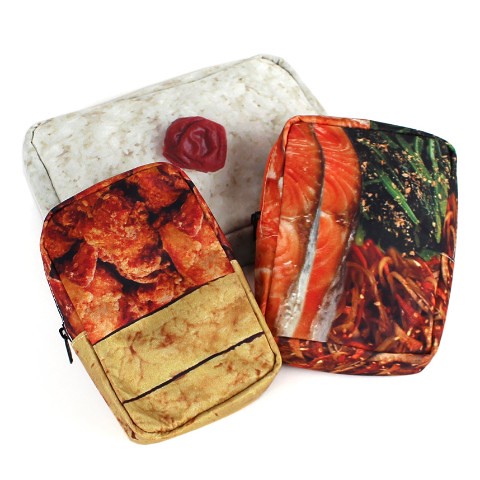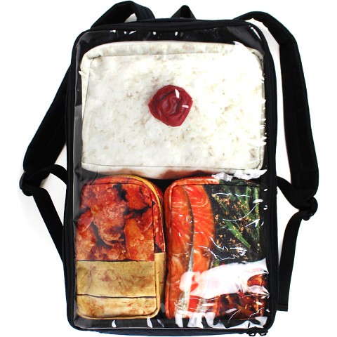 這款「便當背包」光是從外觀看就嚇死人,上方滿滿都是晶瑩剔透的白米飯,梅乾具有太陽般的紅潤色澤,讓人一望見就口水直流。一旁的配菜則是金黃酥脆的日式炸雞、蓬鬆柔軟的玉子燒、鮮嫩肥美的烤鮭魚及清爽健康的菠菜與金平。不僅讓路人中招,就連自己也快受不鳥,背上街絕對比名牌包還吸睛!至於是稱羨的發光眼還是哀怨的死魚眼,不好說。