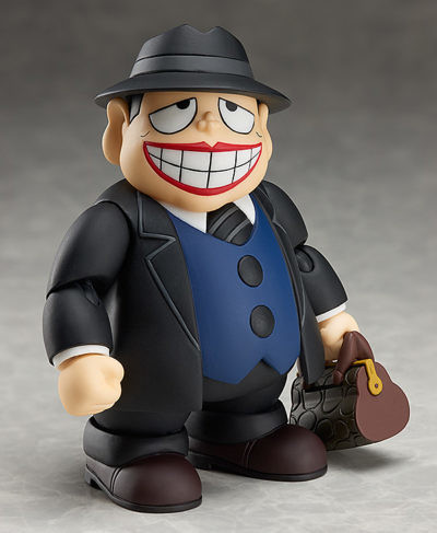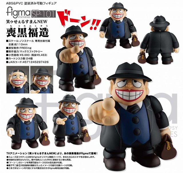 這次作品以《黑色推銷員NEW》劇中喪黑福造特色的體型完全再現,還附有公事包、名片等故事當中所出現的道具物品,當然還有最經典的"巨大右手"可以重現令人印象深刻「咚!」的橋段,還有藤子不二雄Ⓐ老師作品中有著"獨特陰影"的臉部零件可以替換,與可動支架和figma專用台座讓喪黑福造可以擺出各式動作姿勢等等,對《黑色推銷員》有興趣的玩具人可以參考一下歐!