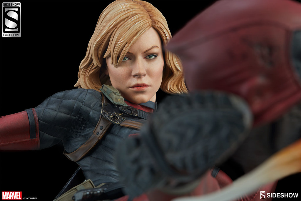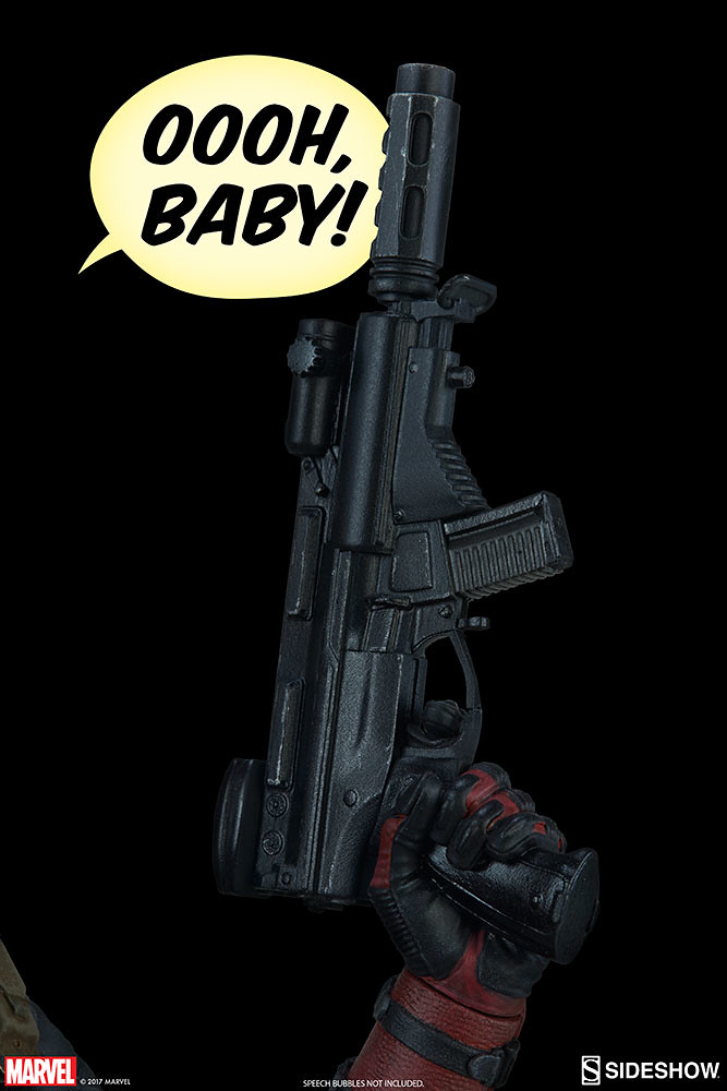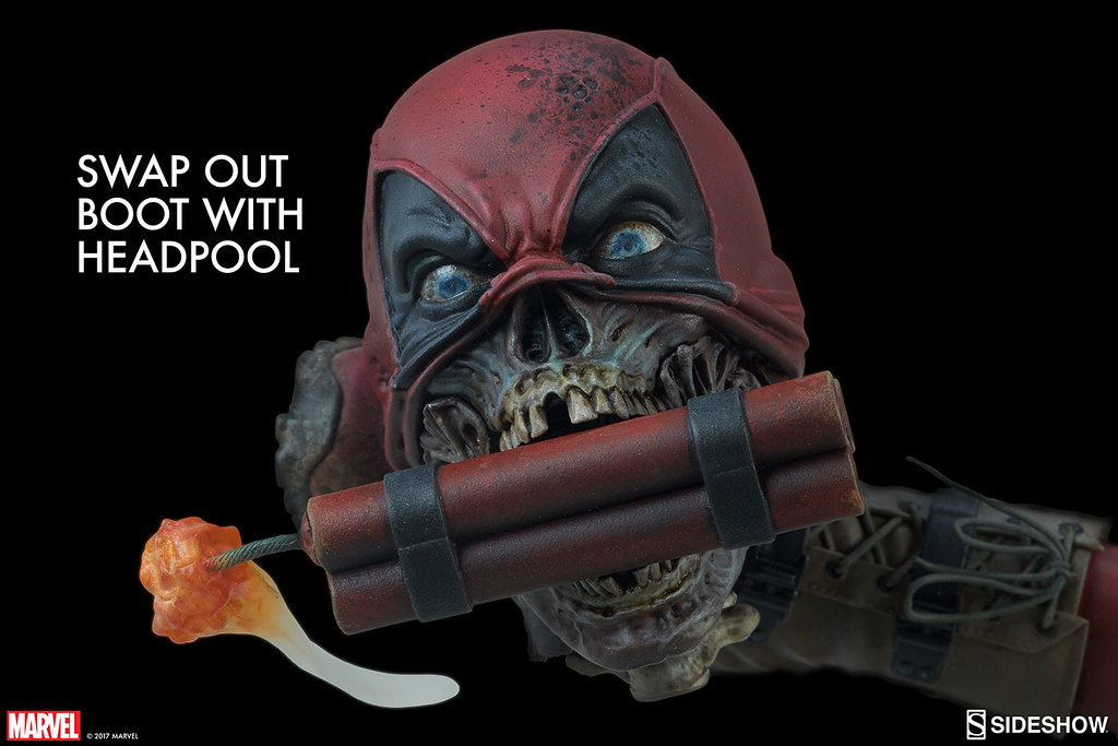 值得一提的是,這次的除了有附上飛踢死侍死人頭的腳部替換配件之外,Sideshow Collectibles 官網限定的版本更是附上了漫畫版本死侍小姐脫掉頭套之後的替換頭雕配件啊啊!!有興趣的玩具人不要錯過啦!