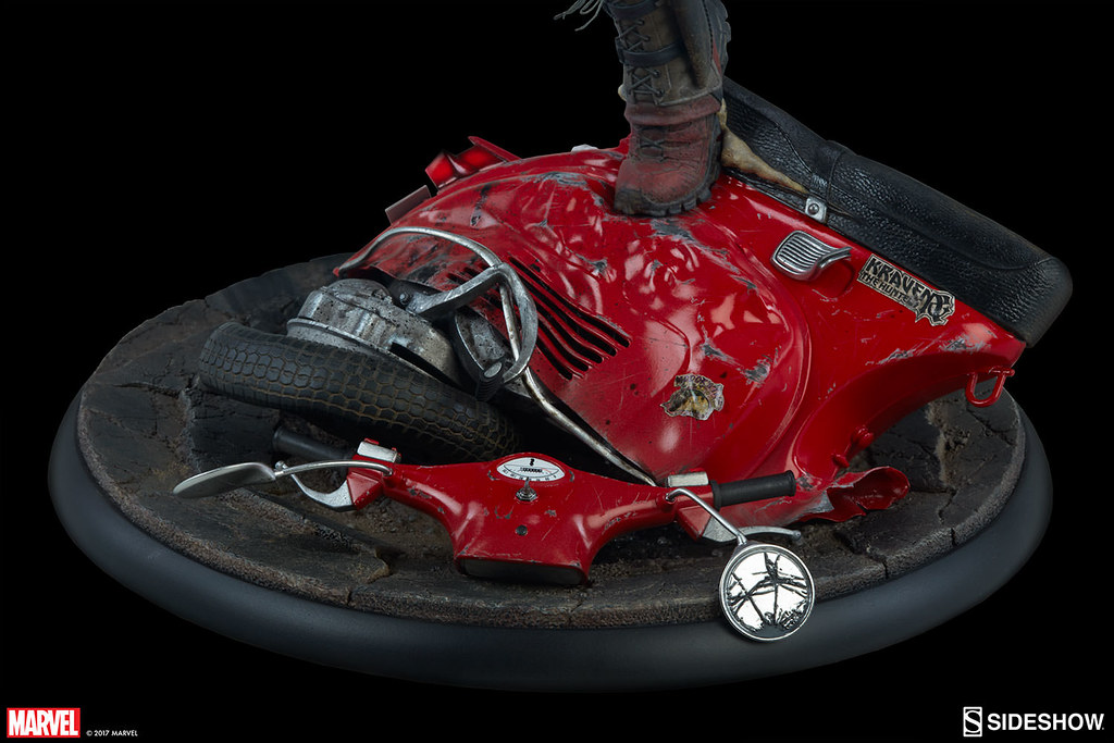 延續之前死侍時間靜止中雕像作品的風格,這次「死侍小姐」的作品依舊是以生動、充滿躍動感的姿態來表現死侍小姐在激烈的槍林彈雨中依舊搞笑的瘋狂戰鬥方式。有別於之前以扭腰閃過熱導火箭彈的設計,這次死侍小姐直接將導彈給踢歪了啊!而手上的武士刀則是把來襲的子彈砍爆,腳下則是踩著一台爛掉的偉士牌機車;整體作品彷彿是捕捉了慢動作的精彩一瞬間!太性給啦!