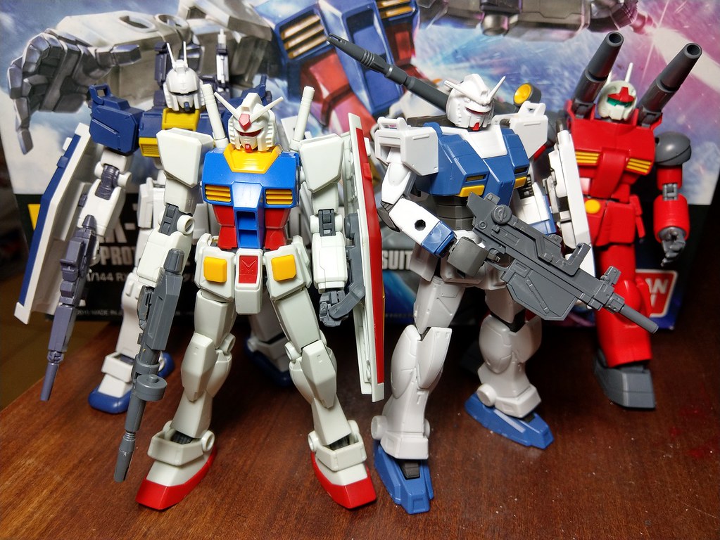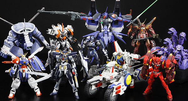 ▼ 我隨手拿了以下幾件HGUC模型試著拚拚湊湊。由於同一時期的鋼普拉幾乎都使用同一套PE軟膠關節,組合上幾乎沒有什麼問題。我也拿了《鋼彈創鬥者》的HGBF系列來做組合,但因為有些是早期的舊模為基礎去改造的,關節系統上有若干差異,就要自己改關節才能組合了。