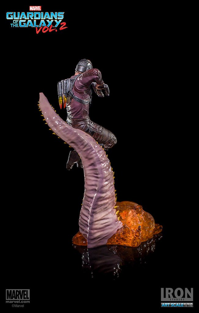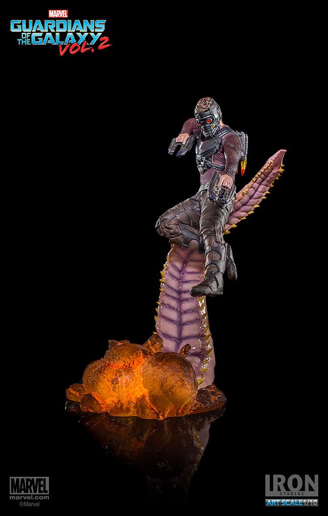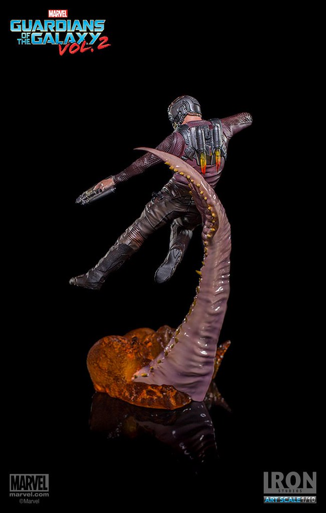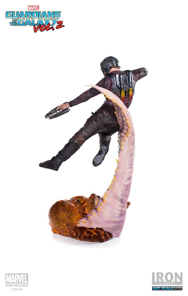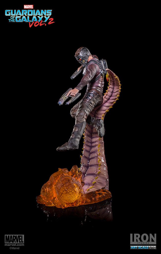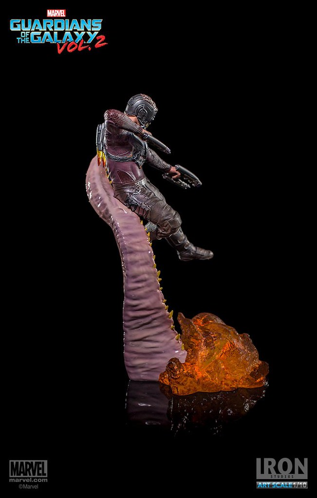 這次Iron Studios 推出的星爵不論是造型還是動態的展現都非常逼真,手握招牌「雙槍」呈現攻擊的姿態,怪物彎曲的觸手更是栩栩如生,在背後的「噴射裝置」也實體化了黃、紅色漸層的火焰特效,頭盔和服裝的刻畫都極為細膩;值得一提的是腹部的線條完全跟飾演星爵的克里斯·普瑞特(Chris Pratt)一模一樣~相信這組決鬥場景雕像湊齊一定會很壯觀啊!