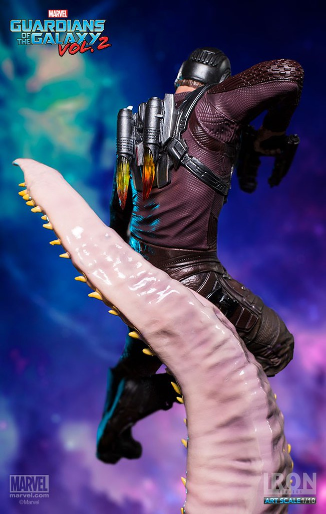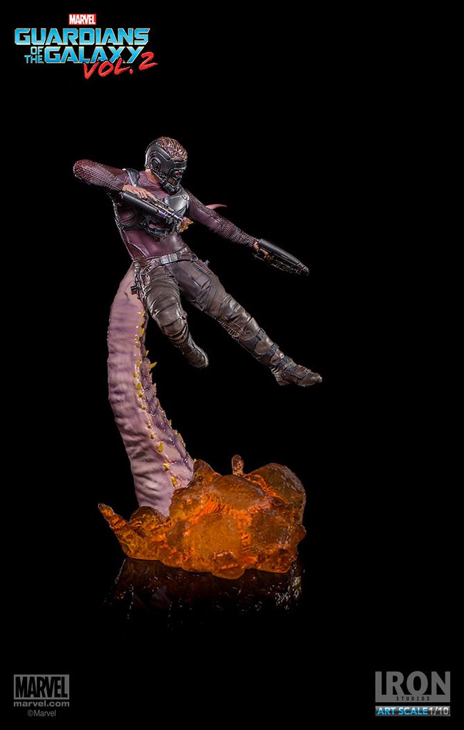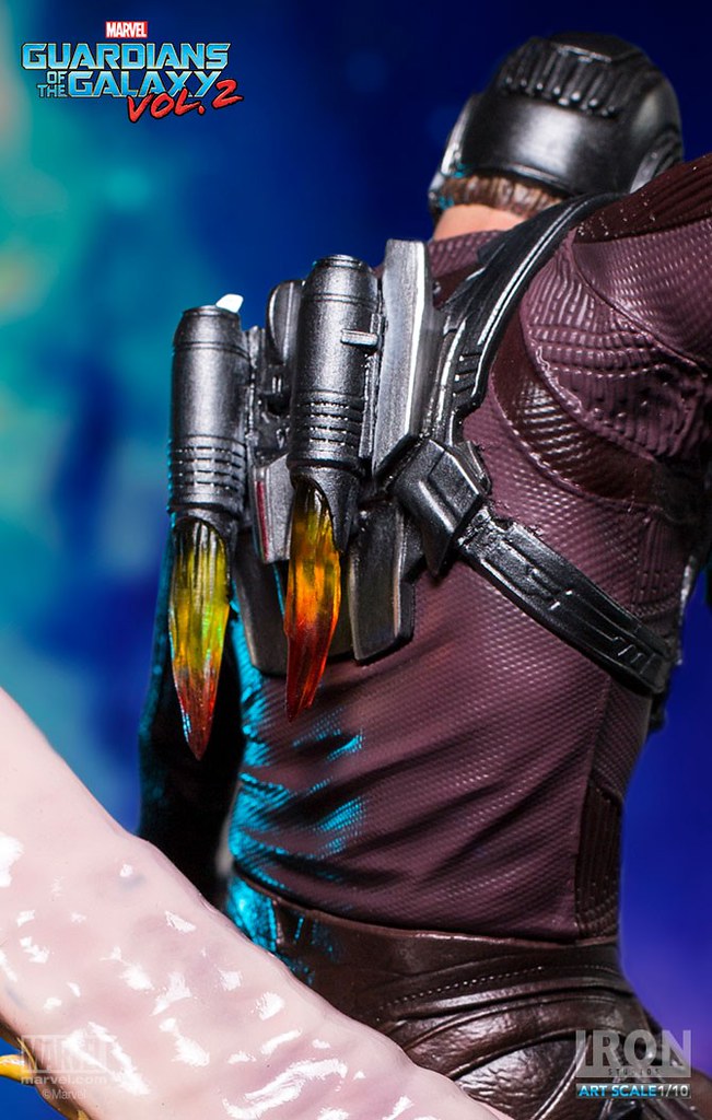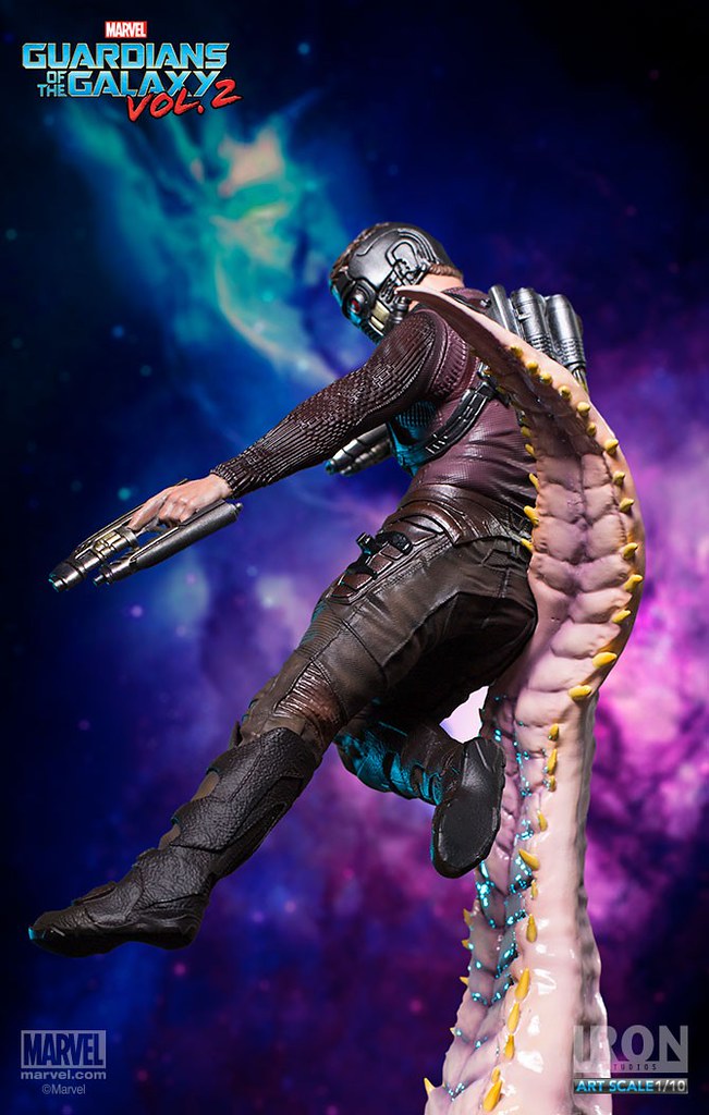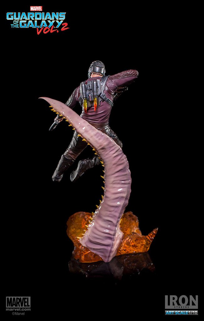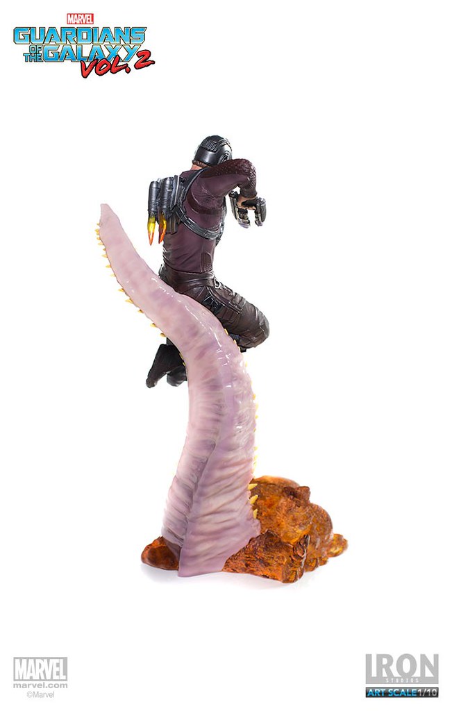 這次Iron Studios 推出的星爵不論是造型還是動態的展現都非常逼真,手握招牌「雙槍」呈現攻擊的姿態,怪物彎曲的觸手更是栩栩如生,在背後的「噴射裝置」也實體化了黃、紅色漸層的火焰特效,頭盔和服裝的刻畫都極為細膩;值得一提的是腹部的線條完全跟飾演星爵的克里斯·普瑞特(Chris Pratt)一模一樣~相信這組決鬥場景雕像湊齊一定會很壯觀啊!