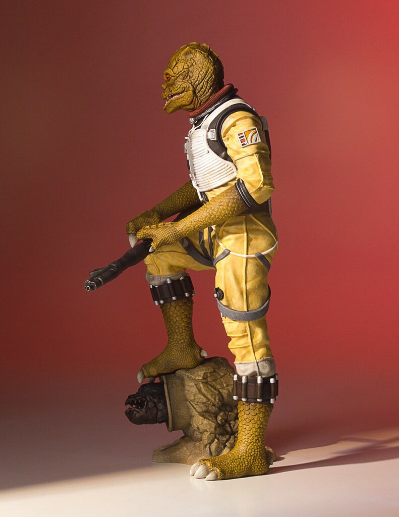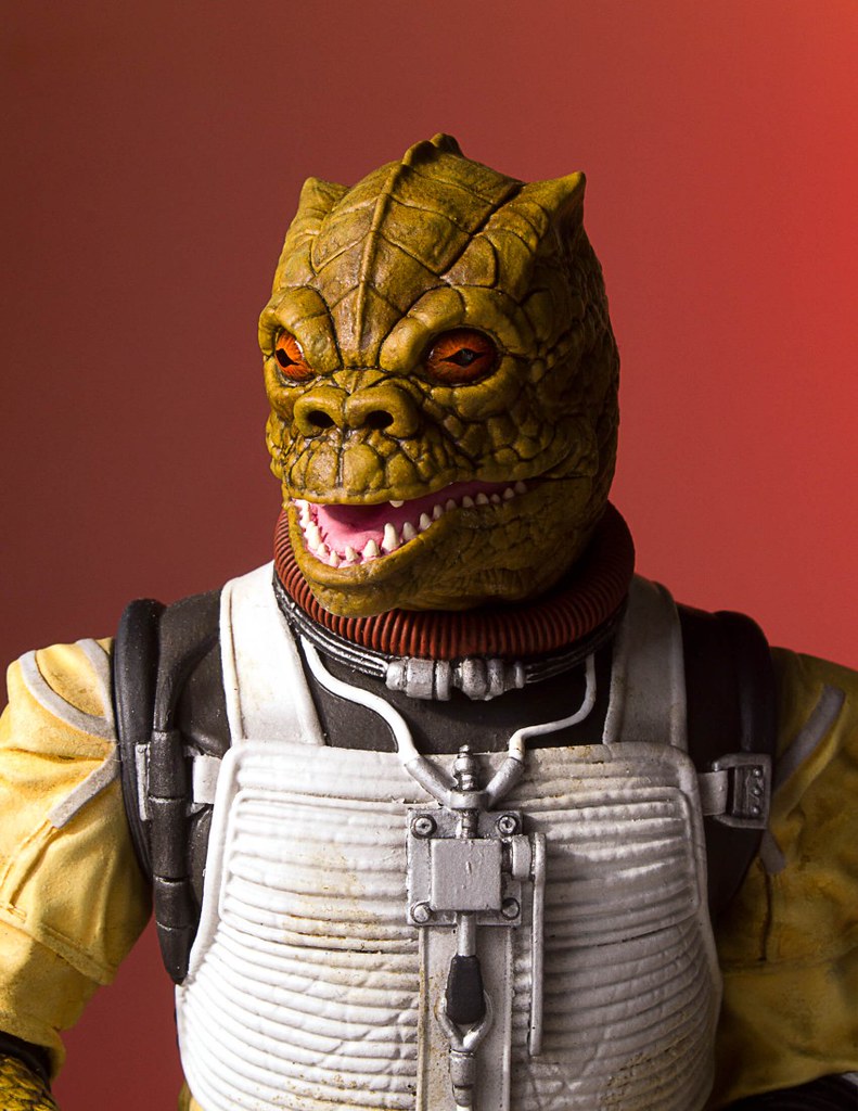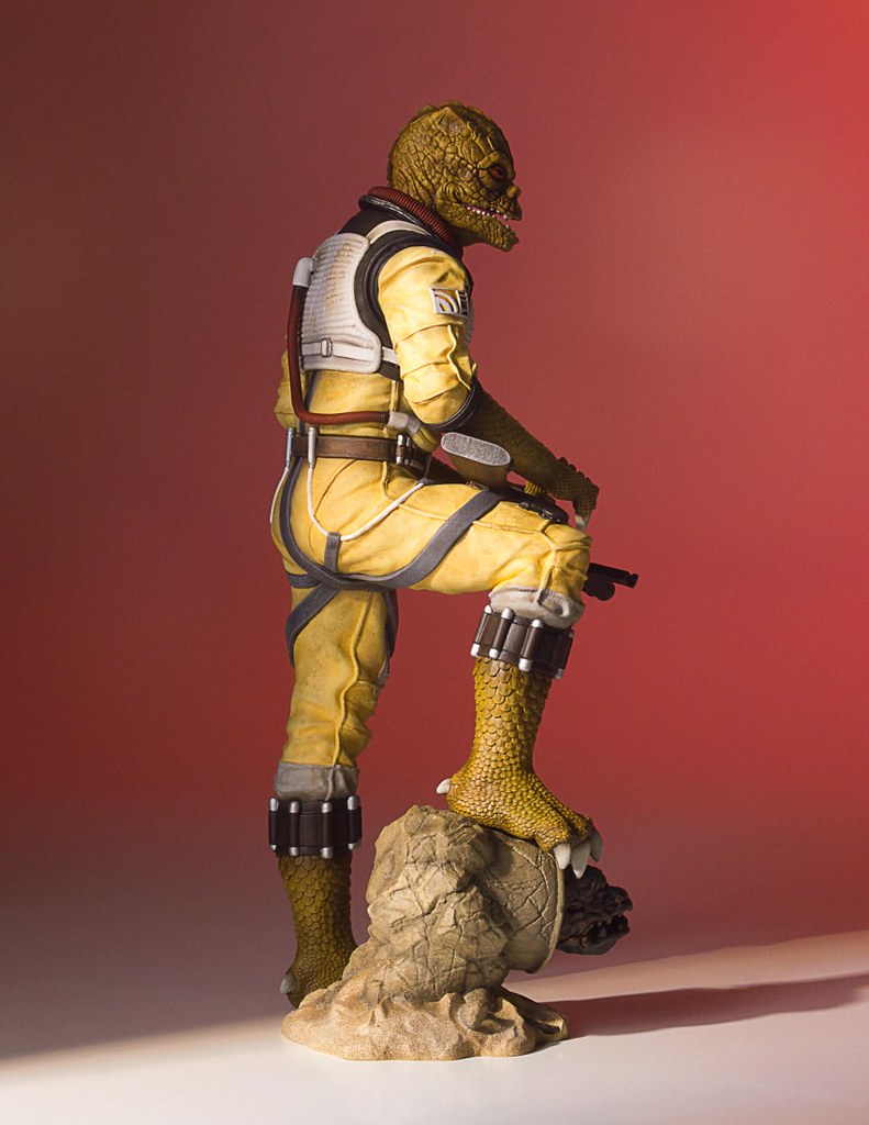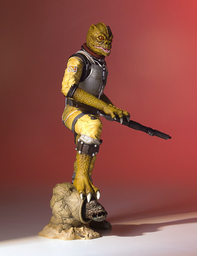 「博斯克1/8 比例全身雕像」採用他在《星際大戰五部曲:帝國大反擊》初登場的黃色服裝,刻畫地相當細膩,在各處施以舊化、髒污的塗裝讓整體看起來更顯逼真,而他佈滿鱗片的皮膚紋理也高度還原,呈現出彷彿蜥蜴、鱷魚皮表面粗糙的質感,銳利的雙眼、鼻孔、和微開的嘴巴也展現他一貫的凶惡形象。