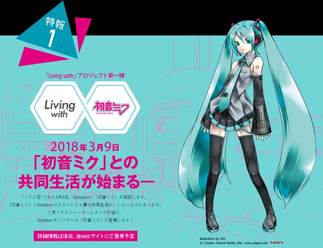 由日本 Gatebox 公司(原:株式会社ウィンクル)研發的跨時代產品 - 全像投影交流機器人「Gatebox」在 2016 年發表後便受到各方注目,引起廣大的迴響與話題。日前更宣佈展開「Living with」計畫,第一彈將與虛擬歌姬「初音未來」合作,預定於 2018 年 03 月 09 日(初音日)釋出全新內容,讓初音未來融入你的現實生活中!