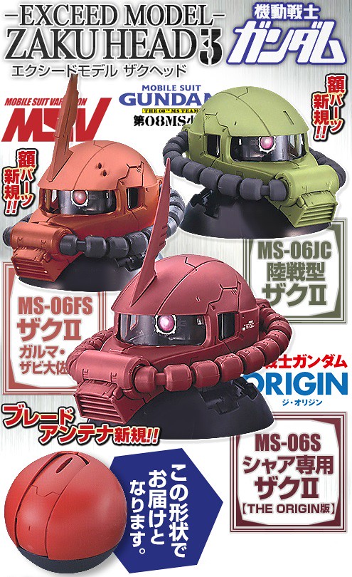 由日本 BANDAI 玩具公司轉蛋事業部發行,有著超越轉蛋水準的精密細節,甫推出就熱賣到處處缺貨的「EXCEED MODEL ZAKU HEAD」薩克頭像,繼第1彈基本款、第2彈王牌機師款後,日前再度發表了令人期待的第三彈「機動戰士鋼彈 EXCEED MODEL ZAKU HEAD 3」預計於 2017 年 11 月發售的消息。