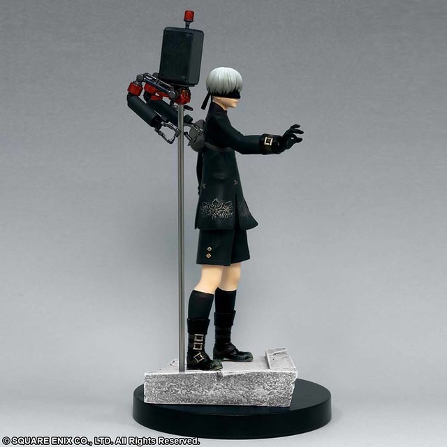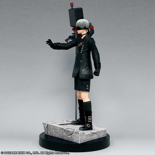 「NieR: Automata Character Figure <寄葉九號S型>」與先前遊戲豪華版「NieR:Automata Black Box Edition」中同梱的「2B」有著相同的比例,全高約 150mm。在黑色的服裝上充滿了精緻的金屬色花紋與飾品,腳底踏著廢墟都市龜裂的地磚,伸出右手的9S彷彿正在專注執行駭入攻擊,一旁還有「輔助機153」陪伴著!