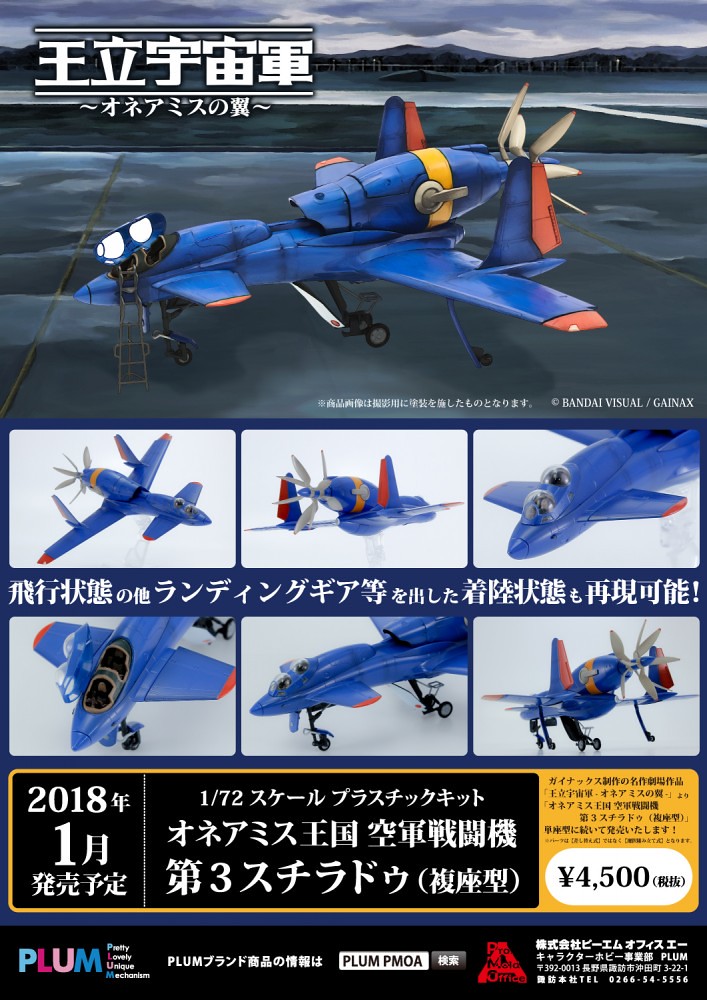 日廠PLUM這次將推出經典動畫《王立宇宙軍~歐尼亞米斯之翼~》當中的歐尼亞米斯王國 空軍戰闘機 第三斯特拉杜(複座型)オネアミス王国 空軍戦闘機 プラム 第3スチラドゥ(複座型)(名稱暫譯),1/72比例尺寸的組裝模型作品,這次將劇中有著特殊的流線飛機造型完整呈現,另外於PLUM ONLINE SHOP訂購還附有"特典"是兩個飛行員(パイロット)配件,喜愛《王立宇宙軍》動畫作品的玩具人可以參考一下歐!