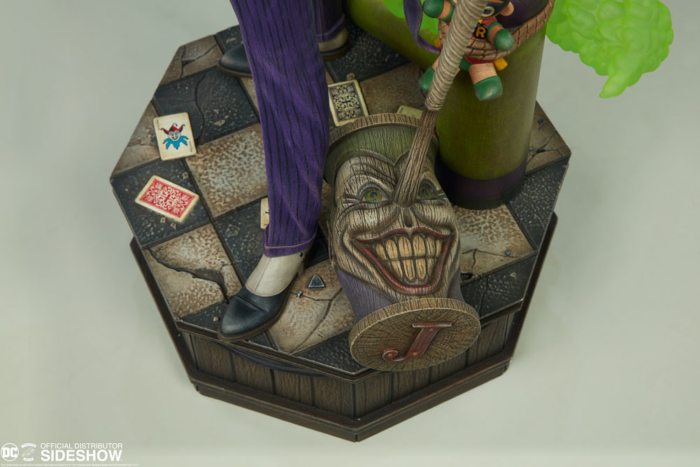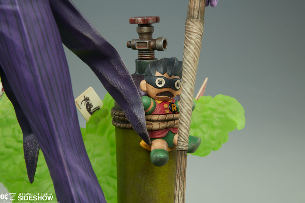 這次Sideshow 與Tweeterhead 聯手打造的Super Powers Collection 第五彈的作品可說是相當的厲害啊!除了在小丑本體的刻畫,包含臉部表情、身上紫色西裝的細節處理都非常細膩啊!此外,在地台與配件的設計更是精美,除了有一個綁著羅賓娃娃的毒氣鋼瓶之外,那一個超霸氣小丑大木槌武器更是經典啊!