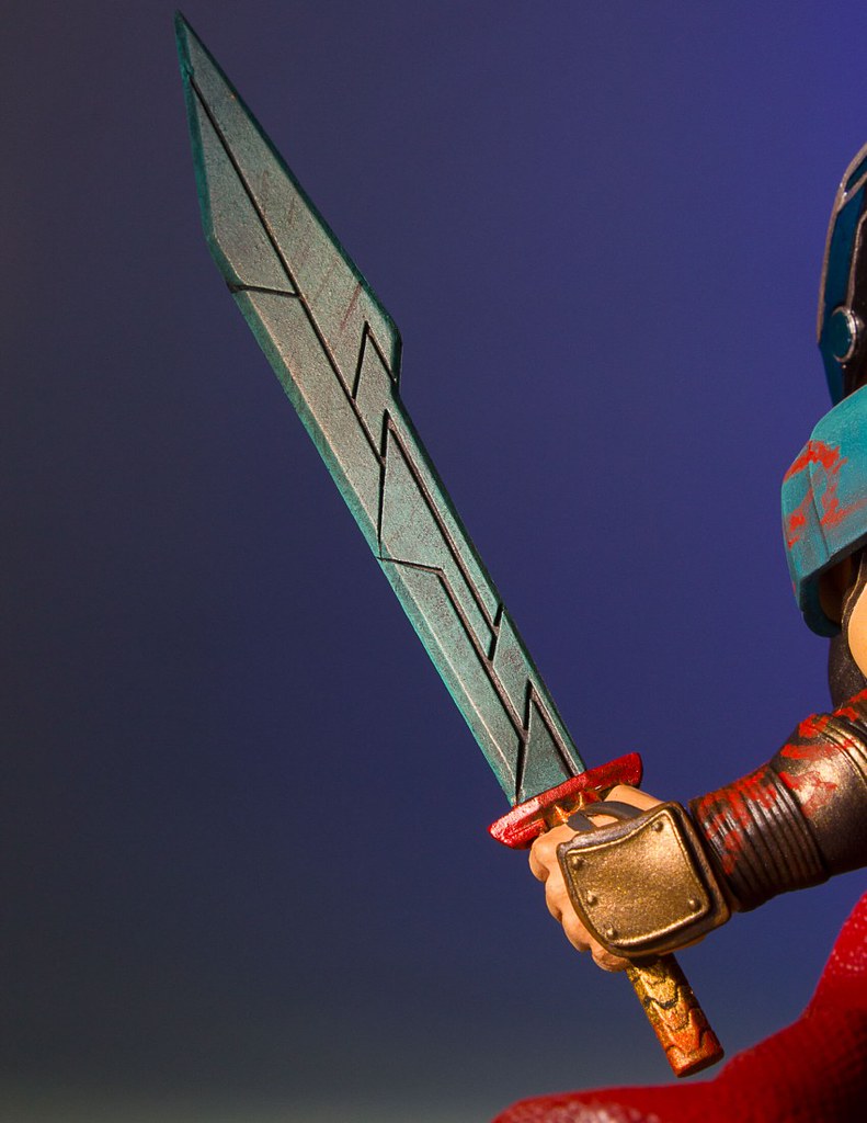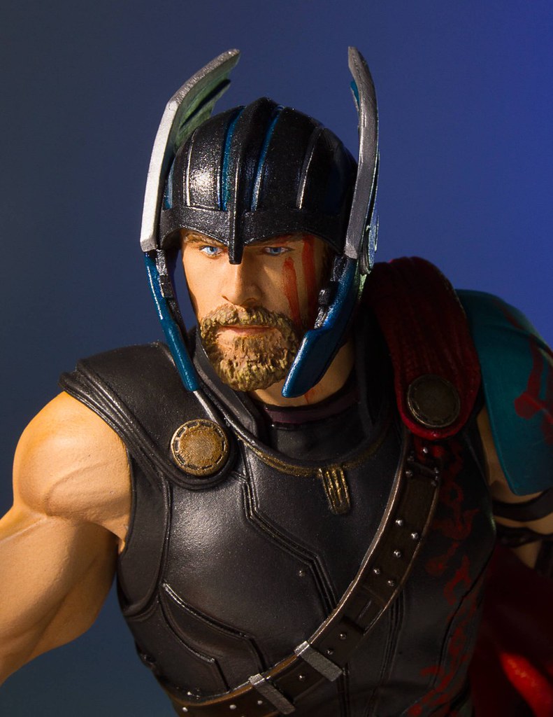 「索爾1/8 比例全身雕像」身穿競技場鬥士的服裝,手握藍色雙刀、大步向前的姿勢相當有魄力,飄揚的紅色披風更增強作品的動態,不管是皺摺、還是些許的破損都細緻地呈現,全身的裝備、護甲刻畫也十分考究,尤其身體左半邊的紅色文字相當精彩,生動的姿態和全新的造型,這款索爾實在非常吸引人;而Gentle Giant 也預告將會推出「角鬥士浩克」雕像作品,一定要兩個擺一起才霸氣啊!