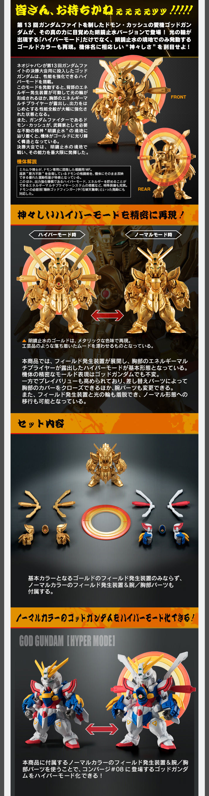 「FW GUNDAM CONVERGE:CORE 神鋼彈 明鏡止水套組」以第8彈中的神鋼彈為基礎,透過精美的金色塗裝再現熱血的「明鏡止水」姿態!不只是單純的色彩變更,商品中還附有手臂、胸口、背部「力場產生裝置」的展開零件以及光之輪,能在一般模式與超級模式間轉換!另外還包含一般色彩的替換零件,讓第8彈中一般模式的神鋼彈也能一起跟著「超級模式」!
