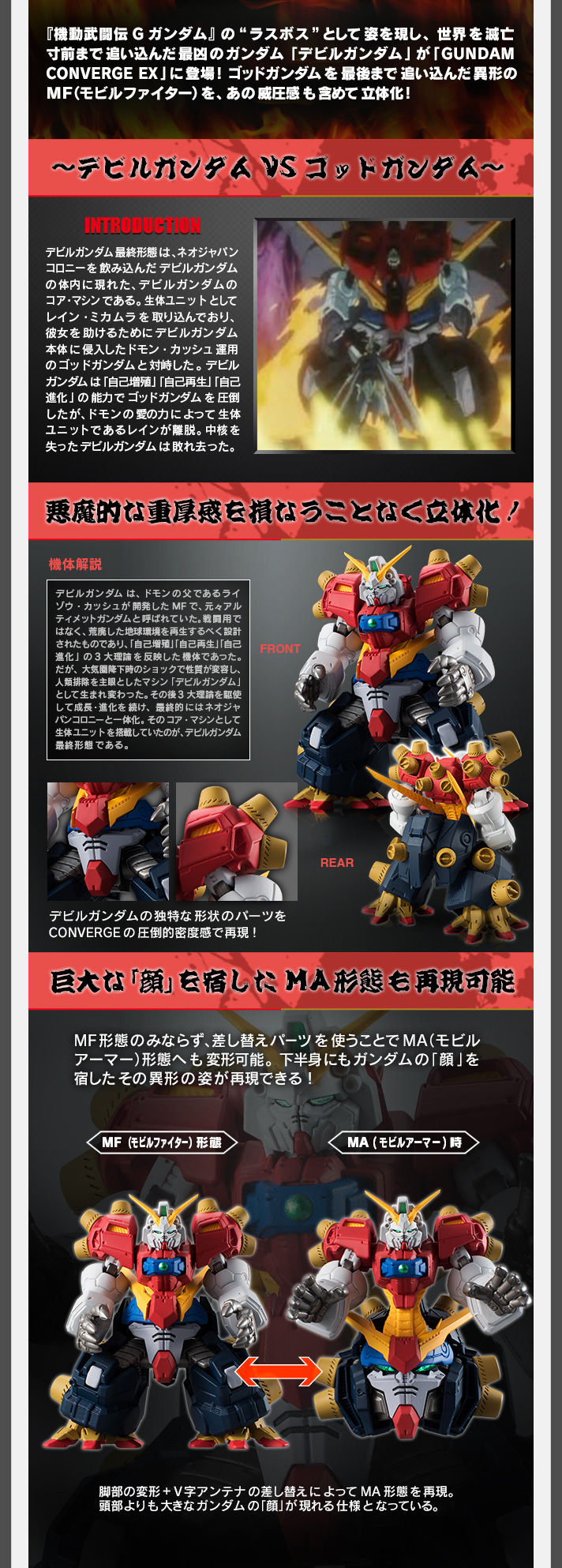 「FW GUNDAM CONVERGE EX19 惡魔鋼彈最終型態」以全高約85mm的尺寸立體化,體型幾乎比一般CONVERGE系列還多上一倍,擺在一起完全突顯出魄力!整體造型表現出惡魔般的厚重感,裝甲上也具有精密的刻線與細節,下半身的鋼彈頭更能透過部份變形與替換零件再現「MF型態」與「MA型態」!
