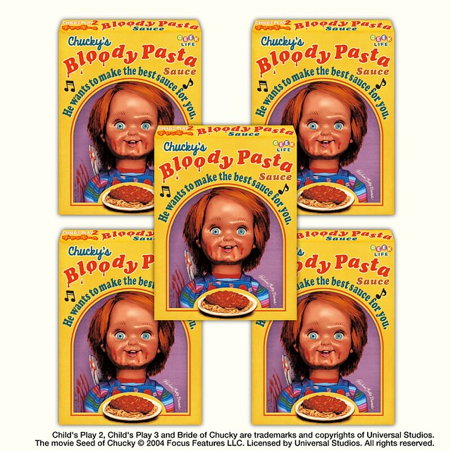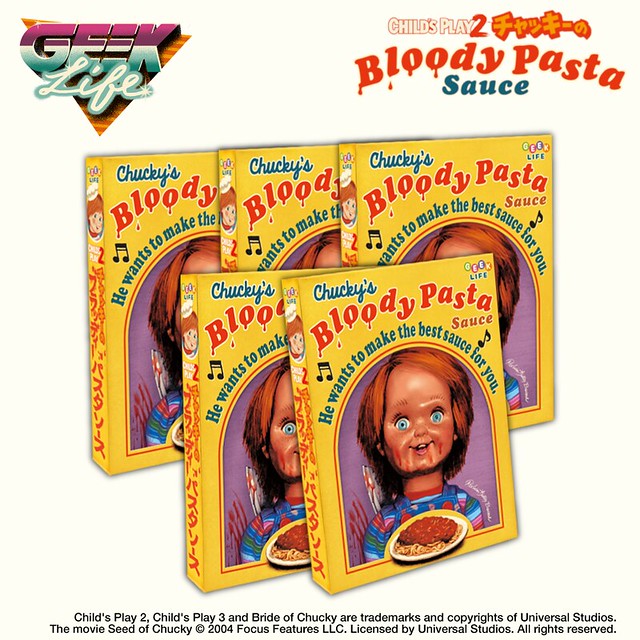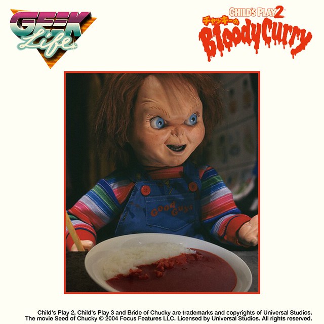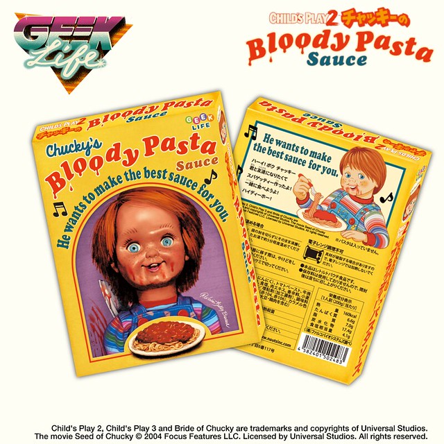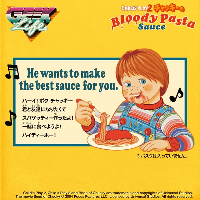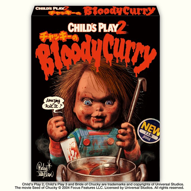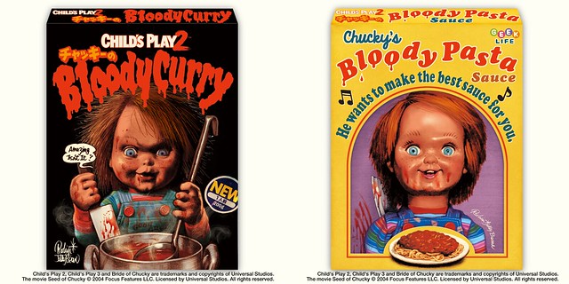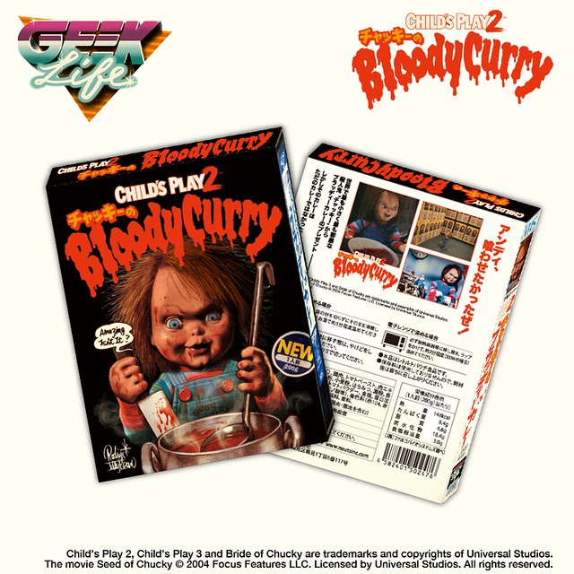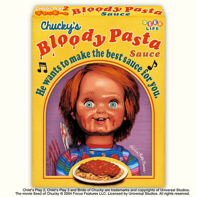日本新興的阿宅主題網路商店「GEEK LIFE」,以經典恐怖片《靈異七殺》主角“恰吉”為主題,推出了恰吉血腥恐怖的殺戮為印象的食品料理包「恰吉的血腥咖哩」&「恰吉的血腥義麵醬」! 並請到了世界知名的蒙面插畫大師Rockin'Jelly Bean 繪製封面。