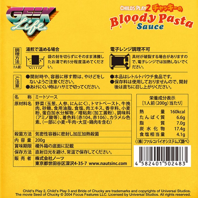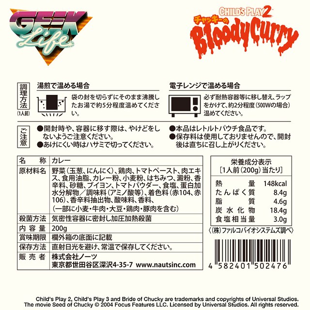 這次的作品是由「GEEK LIFE」獲得環球電影的授權,推出了以“恰吉”為主題的原創商品 - 「恰吉的血腥咖哩」&「恰吉的血腥義麵醬」,刻意將商品以食用色素調色為血腥的暗紅色,彷彿象徵著恰吉變態又殘忍的血腥殺戮。 除此之外,本作最大的特色在於請到了Rockin'Jelly Bean 繪製包裝封面,並且將包裝整體的視覺刻意設計成復古的錄影帶造型。