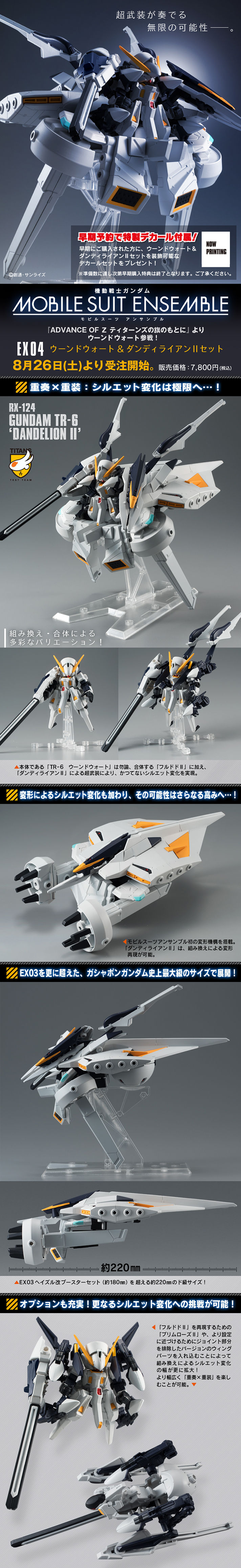 日Bandai萬代玩具公司的轉蛋事業部門GASHAPON,此次將以全新可換裝"MOBILE SUITE ENSEMBLE"系列來推出轉蛋商品,之前也曾以「MOBILE SUIT ENSEMBLE」系列公開預計推出編號"EX"的「全武裝獨角獸鋼彈」、「剎帝利」以及「海茲爾改(泰坦配色)」,還有系列的、「第一彈」、「第三彈」與「特別彈」後,近日官網繼續公開將推出編號"EX04"的「鋼彈TR-6 伍德沃特&丹迪瑞恩II (ウーンドウォート&ダンディライアンIIセット)」(名稱暫譯)機體以及大氣圈突入模組和武裝套件!