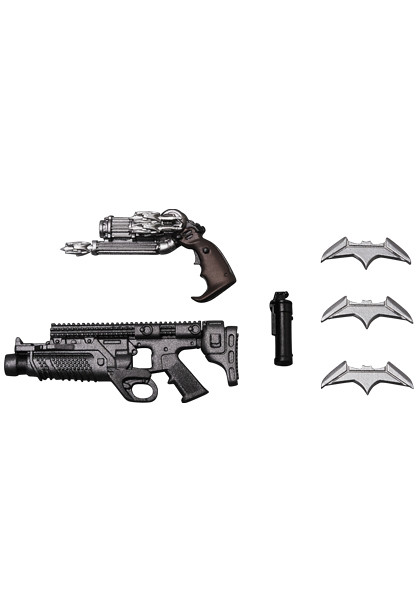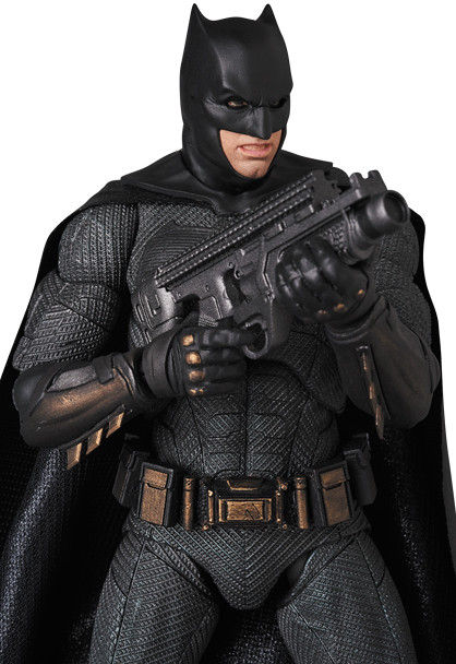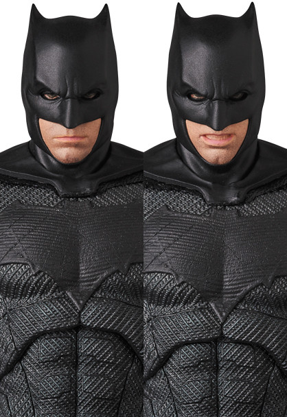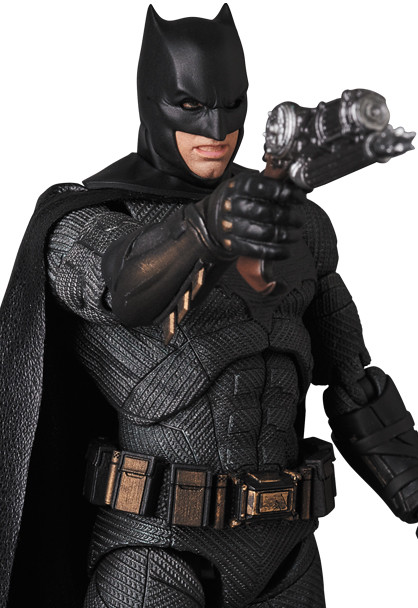 這次MAFEX 推出的作品還原了班·艾佛列克所詮釋的蝙蝠俠,考究的蝙蝠戰衣纖維質地十分精緻,在手部護甲、腰帶的部分施以舊化,呈現出逼真的使用痕跡,頭雕有普通、咬牙兩種版本可以替換,武器部分有三片蝙蝠飛鏢、鉤爪槍、榴彈發射器;值得一提的是披風採用看似皮革的新材質,小編很期待實體的視覺效果和觸感啊~~