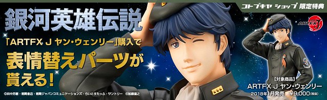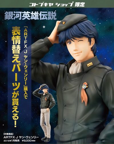 十分受歡迎的科幻動、漫畫之作《銀河英雄傳說》,此次由壽屋玩具公司將以ARTFX J立體造型系列來推出劇中主要登場角色「楊威利(楊文里) ヤン・ウェンリー」(名稱暫譯),在故事中他與宿敵另外主要角色「萊因哈特·馮·羅嚴克拉姆」惺惺相惜,戰爭才華不分伯仲,但在戰術上楊威利智謀則略勝萊因哈特一籌,被譽為戰場上的"魔術師"。