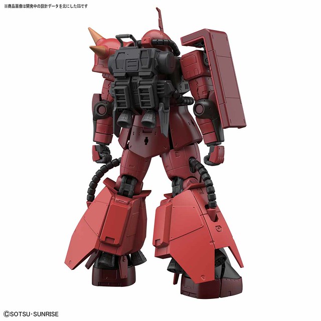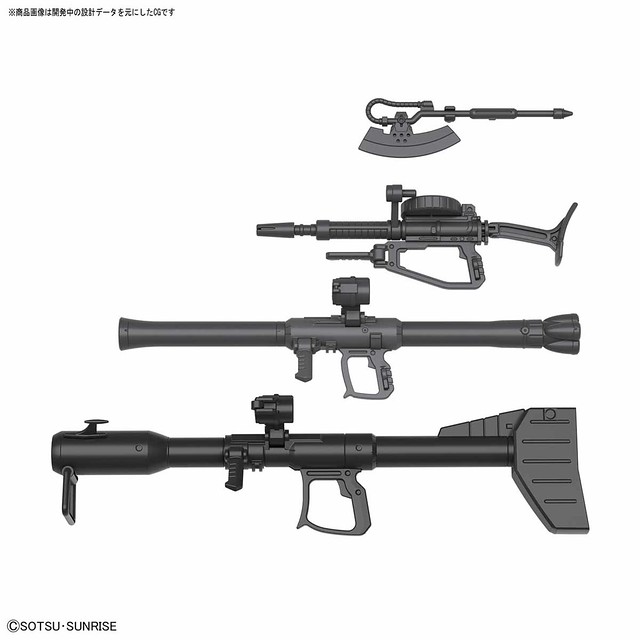 腿部噴嘴能替換兩種樣式,部份除了常見的造型外,更是首次將大河原邦男老師繪製的MSV插畫中的「四孔造型」立體化!武器部份包含薩克機槍、熱能斧等基本武裝,特徵的主武裝「巨型火箭炮」也以RG風格新規製作。