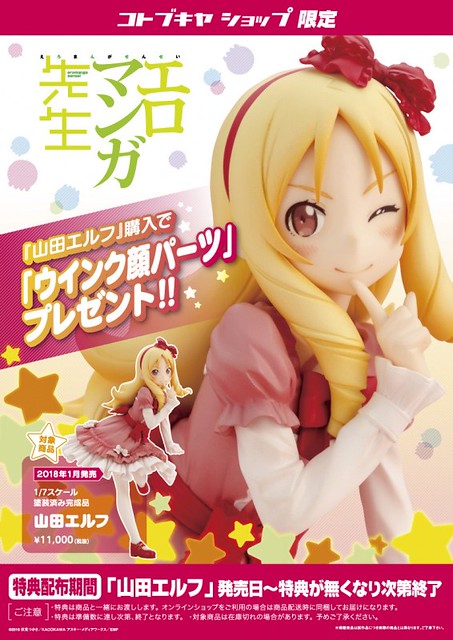 曾經以輕小說《我的妹妹哪有這麼可愛!》打開知名度的日本作家伏見司與插畫神崎廣再度合作的作品「情色漫畫老師」中登場的女性角色「山田妖精(山田 エルフ)」,此次日廠壽屋玩具公司將推出其1/7比例上色完成品,"山田妖精"劇中設定是超人氣的輕幻想小說作家,本名是「艾米莉·格蘭傑」(エミリー・グレンジャー/Emily Granger),小說中設定為13歲,動畫版本則是設定為14歲,其家境非常不錯還有一座私人島嶼。