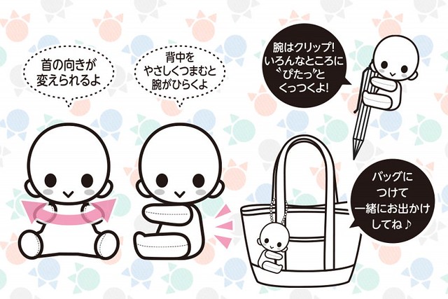 「PITANUI(ぴたぬい)」是一款高度僅 13 公分左右的小型布偶,頭頂設有吊掛用珠鍊。布偶短短的四肢呈現可愛的坐姿,夾子般可展開的雙手能環抱在棒狀物上,頭部也能旋轉90度面向側邊,不論是包包、筆、帽子等各種隨身小物,PITANUI 都能像它的名字一樣成為最適合的飾品,並且展現角色們可愛的魅力喔~!