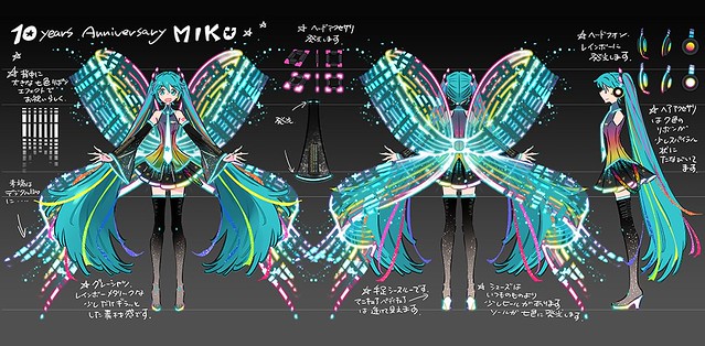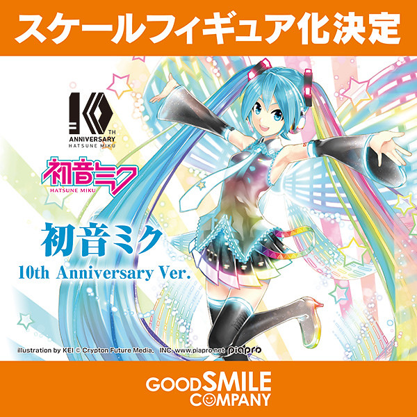 為紀念「初音未來」誕生 10 週年,官方邀請到了擔綱角色設計的KEI以及服裝設計的漫畫家島崎麻里,共同創作出 10 紀念主視覺圖,同時也交由 GOOD SMILE COMPANY 進行立體化。在 10 週年的造型中充滿了「彩虹」要素,背部更有一個巨大的彩虹蝴蝶結,彷彿 10 年間的歷史不斷在眼前回顧,同時也讓人感受到歡愉慶祝的氣氛!