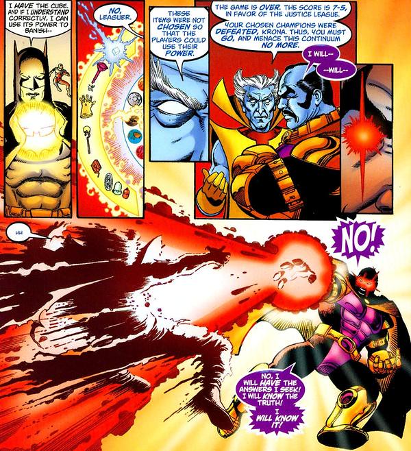 宗師不只挑戰漫威正史宇宙的英雄,也會挑戰"漫威多重宇宙"體系的其他世界英雄。直到有一次,來自DC多重宇宙體系的綠燈俠老敵人Krona出現,他想要理解理解漫威多重宇宙的架構,於是跟宗師挑戰,如果他贏的話宗師得講出漫威多重宇宙組成的秘密,於是雙方使用對方宇宙最強的英雄團隊互相對戰,所以復仇者聯盟(克朗)大戰正義聯盟(宗師),這場史詩決鬥就此開始。