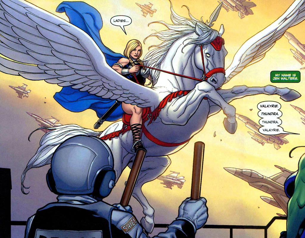 瓦爾基麗雖然主要工作是護衛榮耀死者的靈魂到英靈殿瓦爾哈拉,但她也時常積極協助索爾、希芙和三戰士對抗洛基等人的威脅,這段期間也讓新變種人團隊成員的Danielle Moonstar獲得女武神的力量,更因此讓瓦爾基麗與捍衛者聯盟接觸,並成為其中一員,才開始讓瓦爾基麗跟索爾一樣介入地球事務。在近期的故事里瓦爾基麗加入史帝夫組成的秘密復仇者聯盟來進行秘密行動,更在之後率領全都為女性英雄為成員的無畏捍衛者聯盟。br/>