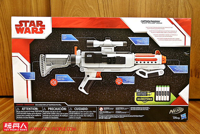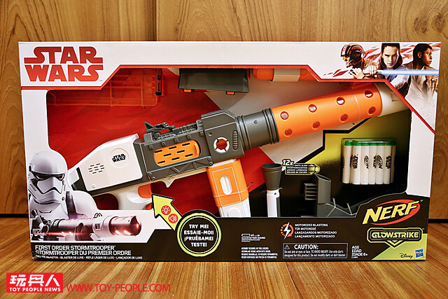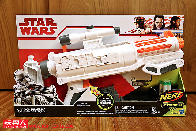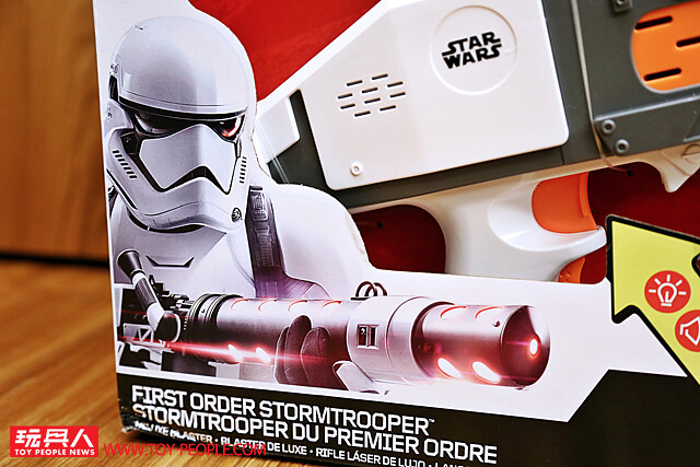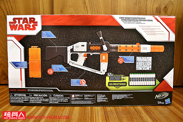 接下來就要介紹本次開箱的重點、也就是大家最期待的NERF系列啦!~ 這次NERF 對戰玩具射擊器所發行的《星際大戰:最後的絕地武士》主題商品,首波一共推出了兩款射擊器,分別是:法斯瑪隊長射擊器(Captain Phasma Blaster)與第一軍團重裝突擊兵豪華版射擊器(First Order Stormtrooper Deluxe Blaster)。 本系列作品除了高度還原原作的槍款造型,並且可以改造用來當作COSPLAY道具之外,最大的賣點就是導入了在2016年《星際大戰外傳: 俠盜一號》NERF 系列作品所開發出的最新技術 - 「發光打擊(GLOWSTRIKE)」。