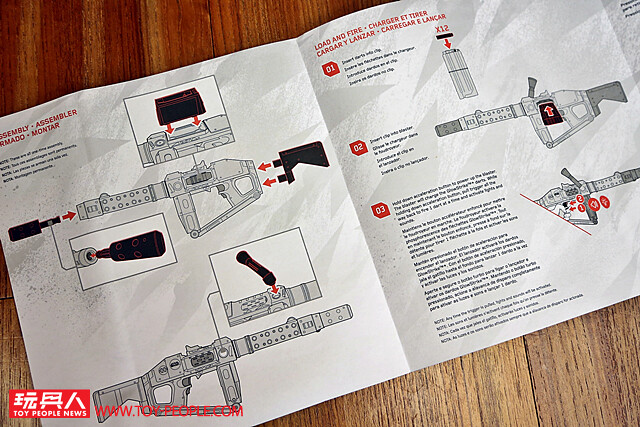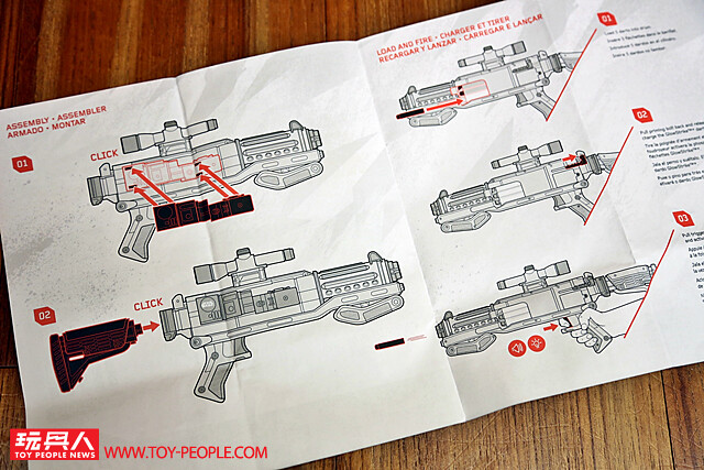 ▼ 組裝與操作說明書。 由於本系列的作品將造型重點放在忠於還原原作,所以捨棄了NERF 系列常見的戰術軌道設計;也因此零件全部設計成裝上就無法拆卸的構造,請各位玩具人在組裝時要看清楚說明書,避免錯誤的方向導致損毀!