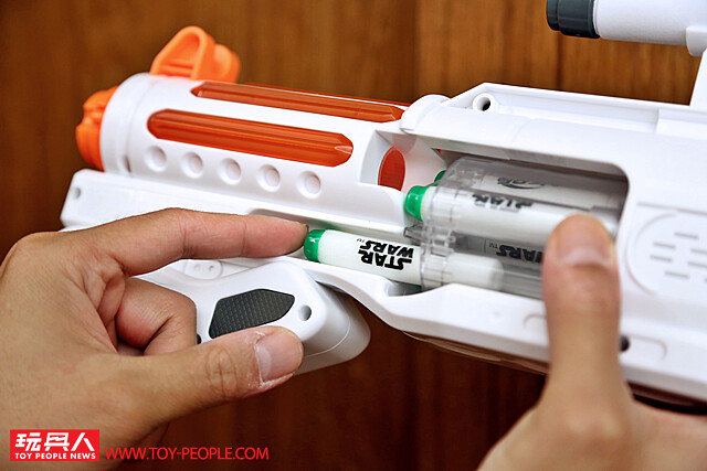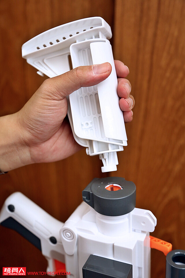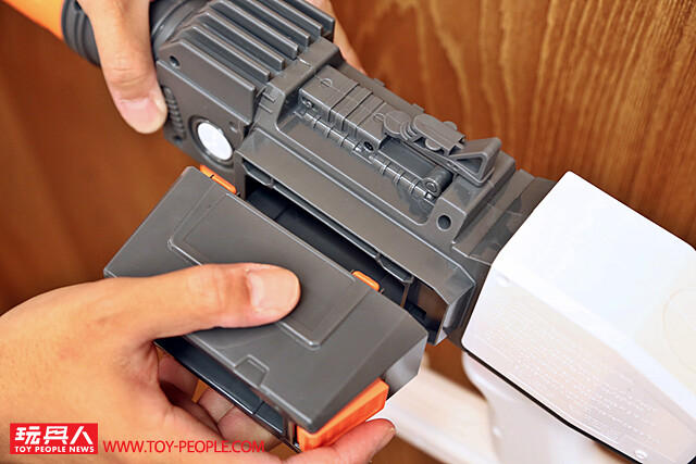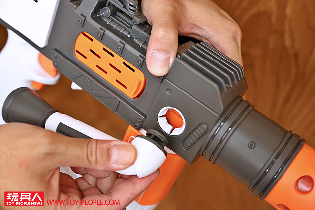▼ 首先將裝飾用的動力電池(Power Cell)零件卡入。 在電影原作中的設定動力電池就是提供Sonn-Blas F-11D 爆擊步槍的能量來源,也就是彈匣啦~ 不過這款射擊器發射的是彈鏢不是真的雷射,所以只是裝飾用的零件,讓整體造型更加完整。