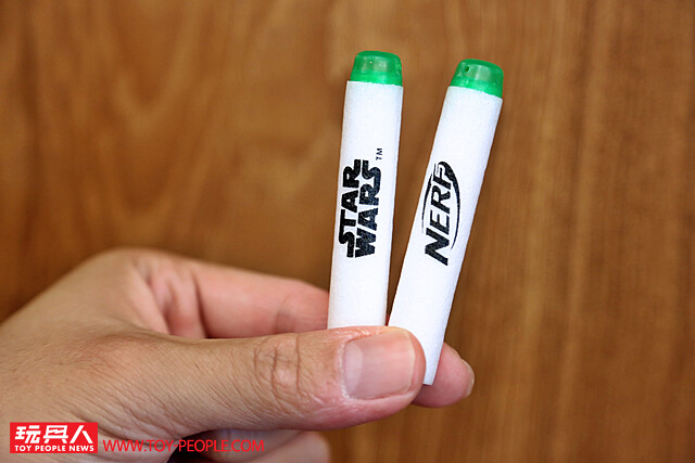 ▼ GLOWSTRIKE 系列的白色彈鏢,這是配方調整過的特殊蓄光功能,與一般的夜光效果不太相同。 GLOWSTRIKE 彈鏢在一般的室內燈光或陽光照射之後,並不會有蓄光(夜光)的效果,藉由槍管中特殊設計的UV 紫外燈,彈鏢就能在短時間內充足的蓄光,發射之後子彈就會呈現發光的效果,並且短暫時間之後消失,藉此呈現出宛如電影中雷射槍射擊的視覺效果。