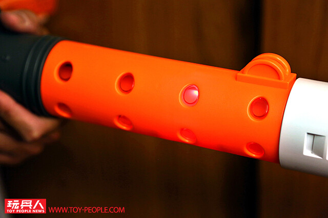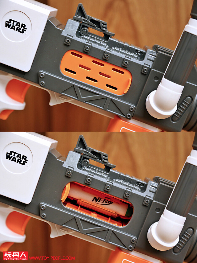 ▼ 底下則是故障排除窗口,如果連續擊發打的太開心不小心卡彈了,就可以打開這個窗口進行故障排除。 另外也維持了NERF一貫的貼心設計,為了避免孩童受傷或操作不當造成槍機損毀,如果故障排除窗口是打開或關閉不完全的狀態下,射擊器就無法擊發。