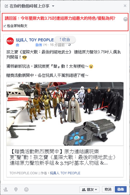 2. 並且轉貼至你的塗鴉牆寫下你的回答「今年星際大戰3.75吋連結原力組最大的特色/優點為何?」。(權限記得要設定成公開,不然小編無法檢查你是否貼文,那就無法中獎嘍~)
