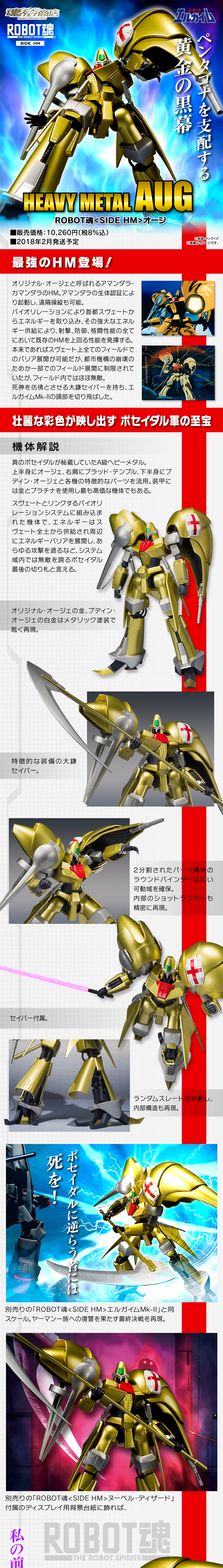 在故事當中與主人翁「達巴(ダバ)」駕駛L-GAiM激戰的「奥津/AUG(オージ)」,有著"金色的死神"稱號來自於它機體的金黃色塗裝,此次一樣把其有著黃金色塗裝盔甲式樣與靈活的可動肩甲,細部造型配合可動性,可以再現動畫中的各式攻擊動作,並附有電磁砲、光劍以及巨大鐮刀等等多款豐富配件,作品預計於Premium BANDAI線上商店在2017年9月8日開始接受訂購,喜歡《重戰機》動畫系列的玩具人可以參考一下歐。