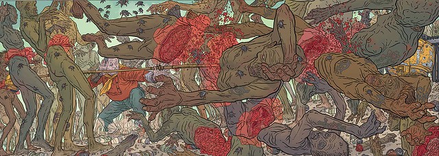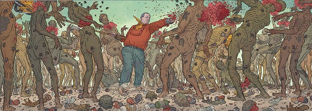 《少林牛仔》的故事發展很有武俠片的味道,離開少林寺的武僧在荒土展開旅程,不斷地遇見壞人、怪物、喪屍等等,而這位沈默的武僧大叔則發揮出超人類的力量將他們一一擊退;Geof Darrow 大師對於細節的描繪非常驚人,每一格的任何地方都可能藏有令人意想不到的驚喜,甚至每次重看都能發現不同的事物,已經可以用極其誇張去形容他對於細節的堅持與追求了~小編真心推薦各位玩具人可以去欣賞他的作品!