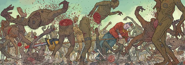 ▼《少林牛仔》其中一部分,瀰漫一股強烈的美系風格線條,飛散的血肉、殭屍噁爛的皮膚紋理都很獨特!電鋸沒電之後就以手為刃,把自己化作最致命的武器,赤手空拳收拾掉一大批殭屍~