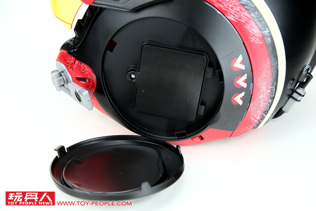 ▼ 藉由精心設計的造型,電池室被巧妙地隱藏在頭盔的造型之中,打開左耳部就能夠安裝電池啟動逼真的音效機能。