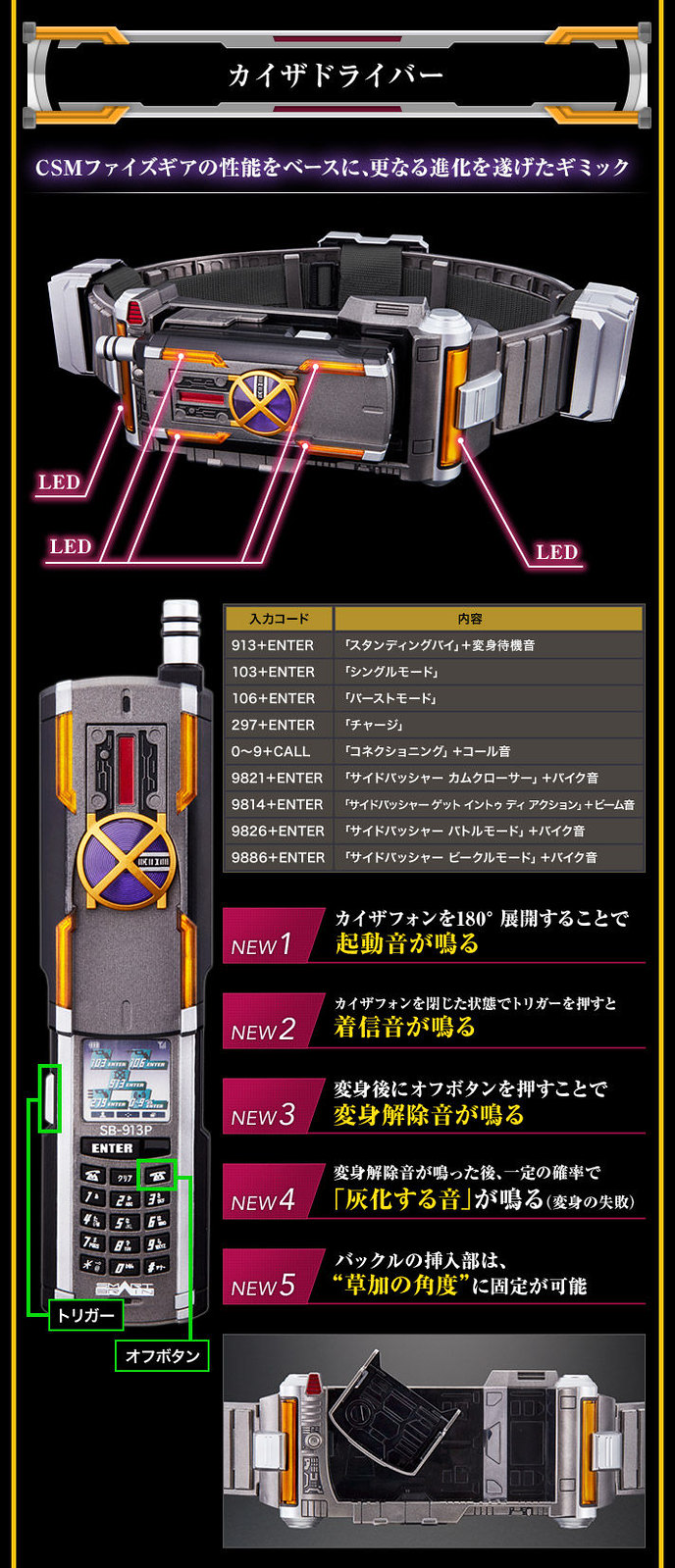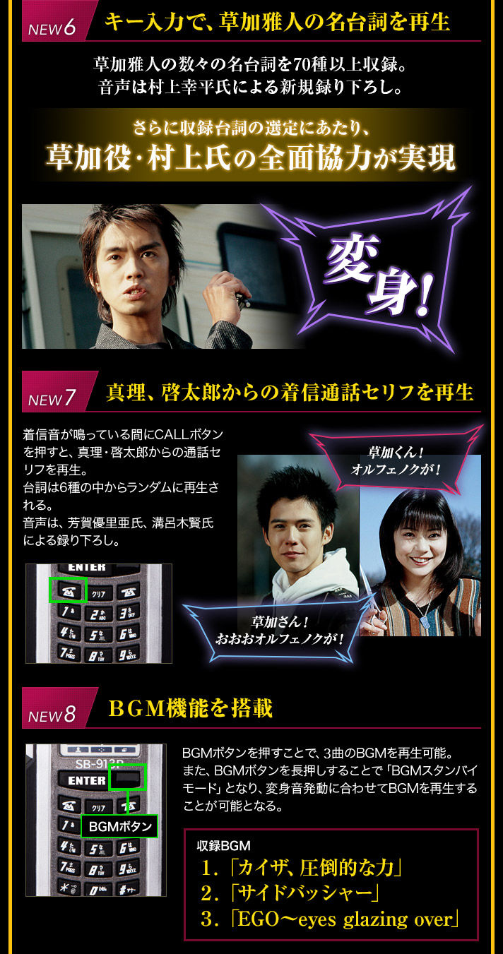 作為核心的手機只要輸入代碼就能發出各種變身、必殺技音效,還有更多新功能像是解除變身後一定機率會發出變身失敗「灰化」的音效XD。另外還能播放角色台詞與劇中BGM回味當時的情境,包含草加本人的台詞、與啟太郎、真理通話的內容以及『カイザ、圧倒的な力』、『サイドバッシャー』、『EGO~eyes glazing over』三首與草加相關的BGM!