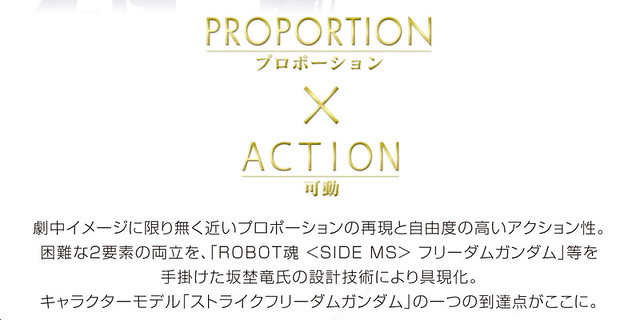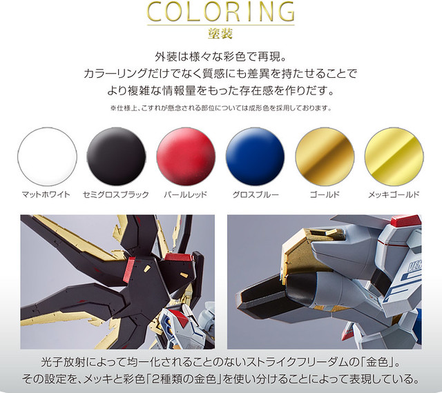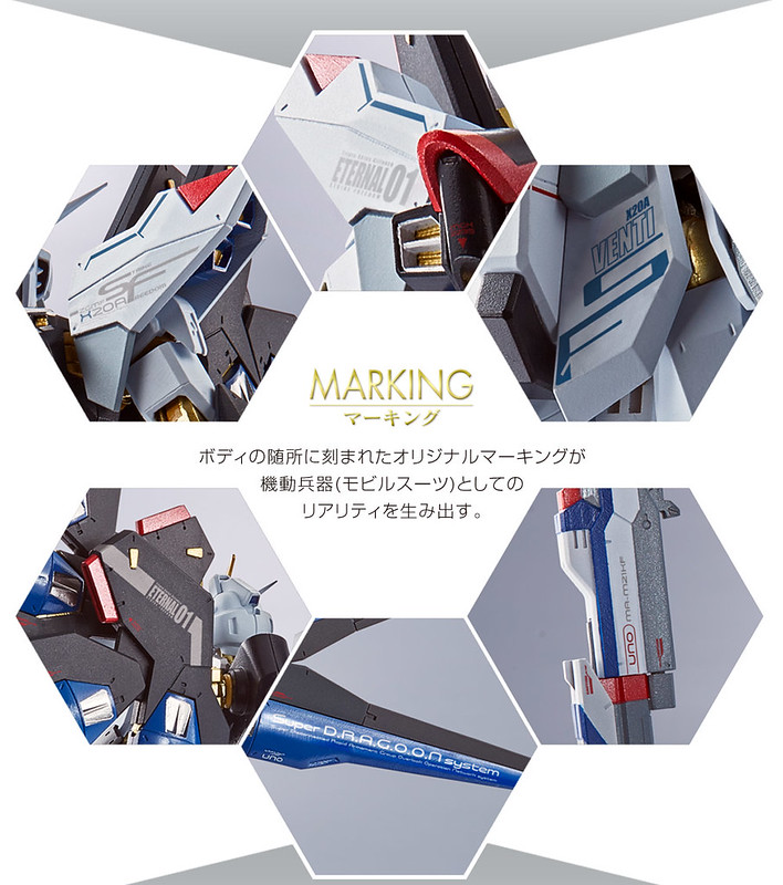 「METAL ROBOT魂 ZGMF-X20A 攻擊自由鋼彈」和前作「00鋼彈」相同,透過原型師 坂埜龍的設計技術將「再現劇中造型」與「高自由度的動作性」兩項困難的要素同時具現化。大部分關節都以合金材質製成,並且施以電鍍處理,綻放出厚重的金閃閃光輝!在塗裝部份不只是僅僅上色,同時也透過不同的色彩表現各部質地。