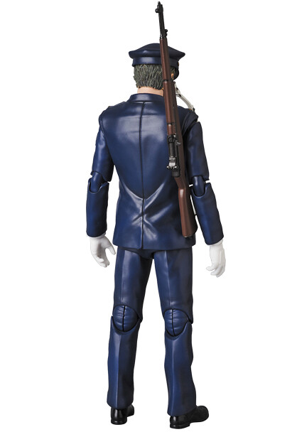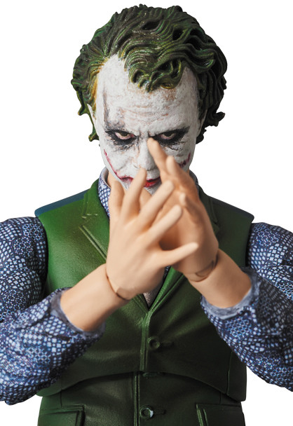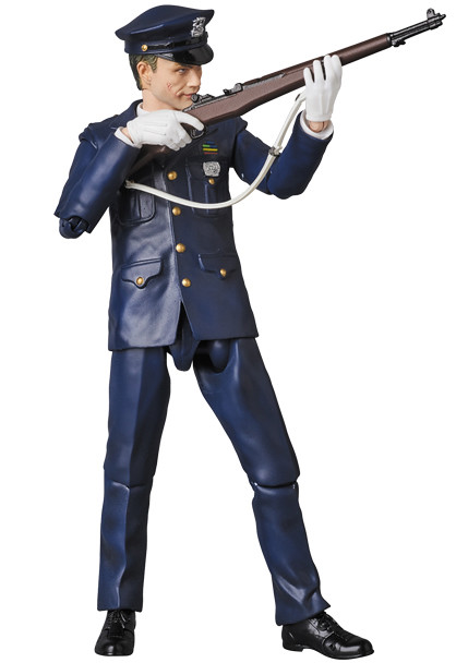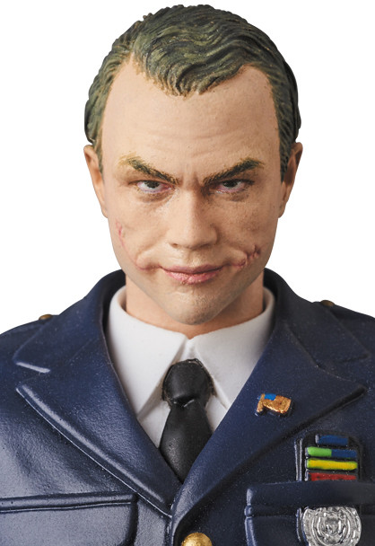 在《黑暗騎士》中小丑除了身穿紫色大衣的經典形象之外,還有像是搶劫銀行、偽裝成警察、假扮護士等等樣貌,這次MAFEX 推出的警察版來自於小丑一行人假扮成鳴槍的「儀仗隊警察」,混入警察局局長「吉利恩·洛布」的悼念儀式中,想趁機槍殺市長,幸好詹姆斯·高登捨身位市長擋下這一槍。