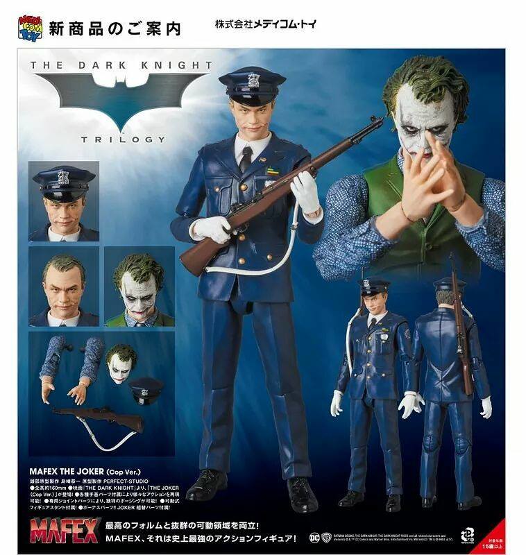 日本知名玩具品牌MEDICOM TOY 公司旗下熱門的可動玩具系列「MAFEX」以電影《黑暗騎士》(The Dark Knight)中的超經典反派「小丑」為題,在推出了「小丑Ver. 2.0」、「小丑 搶劫銀行Ver.」之後,新作「小丑 警察版」(The Joker Cop Ver.)也顫慄現身~預計將於2018年6月發售!