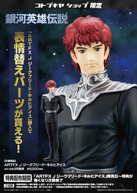 相當受到歡迎的科幻動、漫畫之作《銀河英雄傳說》,由壽屋玩具公司將以ARTFX J立體造型系列來推出其角色造型,已經公開過「楊威利」以及「萊因哈特·馮·羅嚴克拉姆」後,近日官網繼續公佈接下來將會推出「齊格飛·吉爾菲艾斯(ジークフリード・キルヒアイス)」,這次第三波的角色以最接近"萊因哈特"的「吉爾菲艾斯」來呈現,劇中的他在幼年時期就與萊因哈特相識,兩人共同進入一樣的學校,共同參加軍隊後在戰場上並肩作戰。